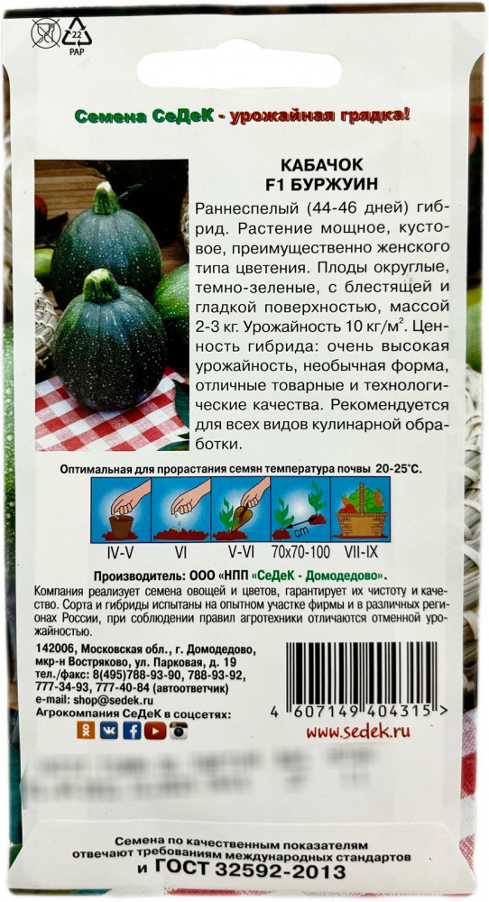 💳 Оплатить за товар можно при получении 🇰🇿 Есть бесплатная доставка по Казахстану 🎁 Копите бонусы с каждой покупки Раннеспелый (44-46 дней) гибрид. Растение мощное, кустовое, преимущественно женского типа цветения. Плоды округлые, темно-зеленые, с блестящей и гладкой поверхностью, массой 2-3 кг. Урожайность 10 кг/м2. Ценность гибрида: очень высокая урожайность, необычная форма, отличные товарные и технологические качества. Рекомендуется для всех видов кулинарной обработки. |