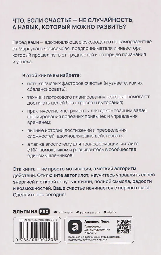 💳 Оплатить за товар можно при получении 🇰🇿 Есть бесплатная доставка по Казахстану 🎁 Копите бонусы с каждой покупки Вдохновляющее руководство по саморазвитию от Маргулана Сейсембая, предпринимателя и инвестора, который прошёл путь от трудностей и потерь до признания и успеха. В книге автор делится личным опытом преодоления кризисов и триумфов, доказывая: счастье — это не случайность и не подарок судьбы, а навык, который можно развить с помощью ясной и проверенной технологии. |