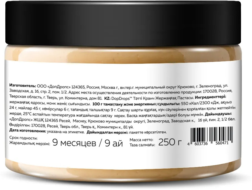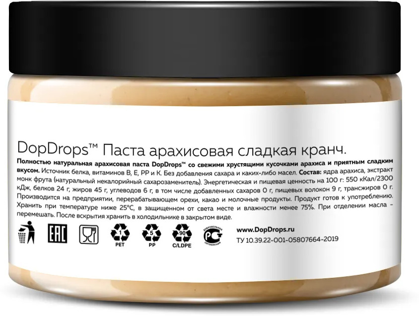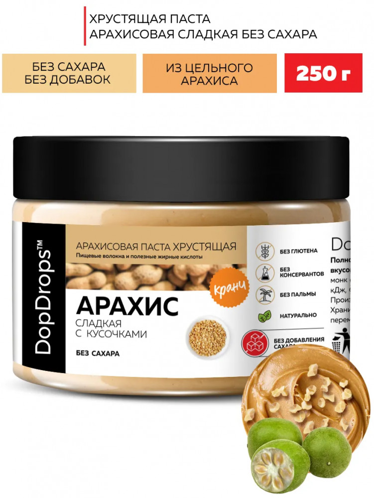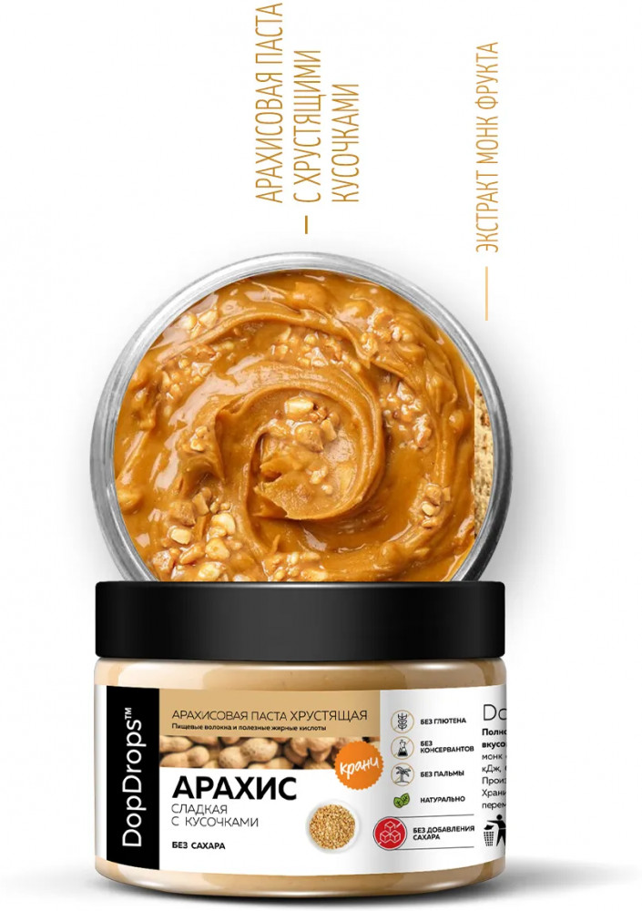 Арахисовая паста с хрустящими кусочками DopDrops — это не только вкусный, но и полезный продукт с огромным количеством витаминов и необходимых микроэлементов. Паста кранч из арахиса без сахара станет незаменимым дополнением к вашему правильному питанию, а также прекрасным угощением для всей семьи. Термическая обработка ореха, помол и фасовка — все это делаем сами. 30 минут от ореха до банки на собственном производстве. Мы не используем отходы, лом и дешевое сырье: только цельный сортовой арахис, специально отобранного премиум сорта. Тщательно контролируем качество на входе, запекаем в воздушной печи, без обжарки и гарантированно избегаем образования канцерогенов при термообработке. Только так арахис сохраняет все свои полезные природные свойства. Арахис жареный проигрывает по вкусу и пользе запеченному.