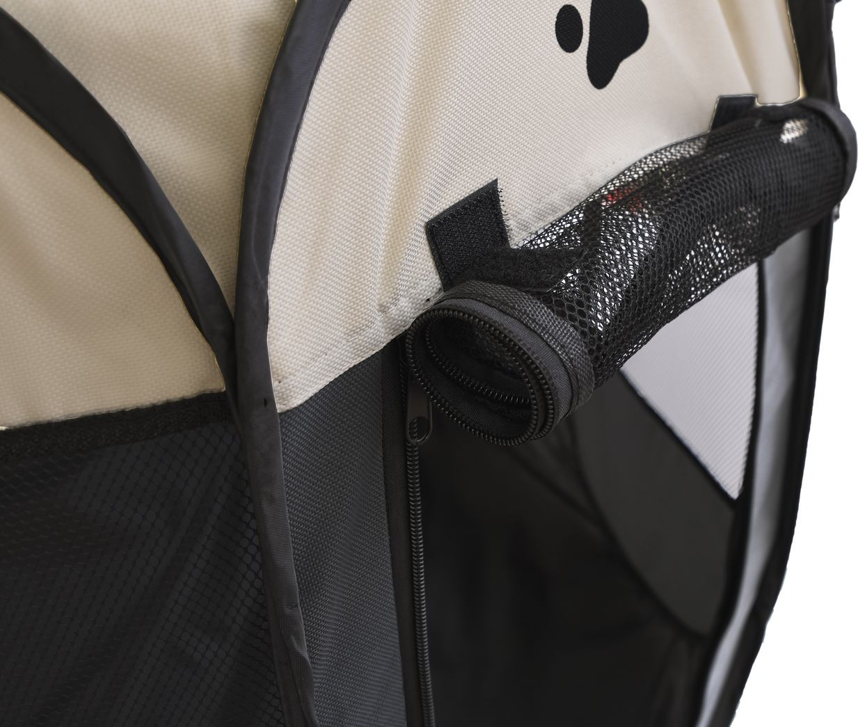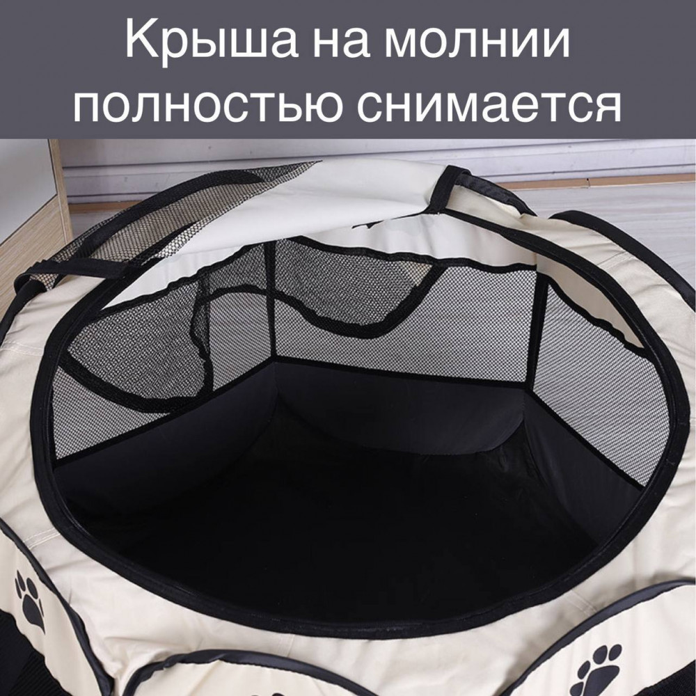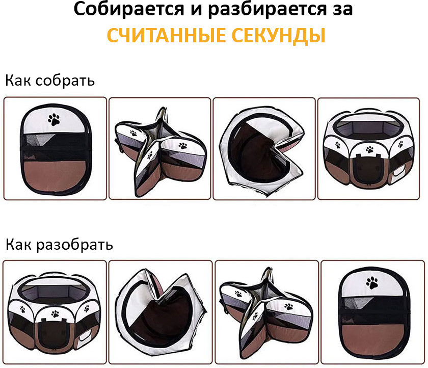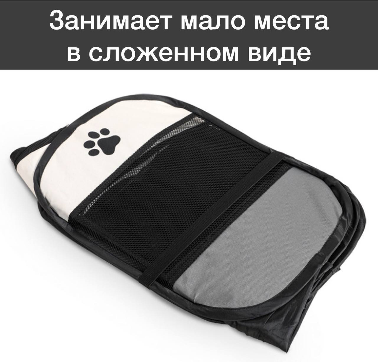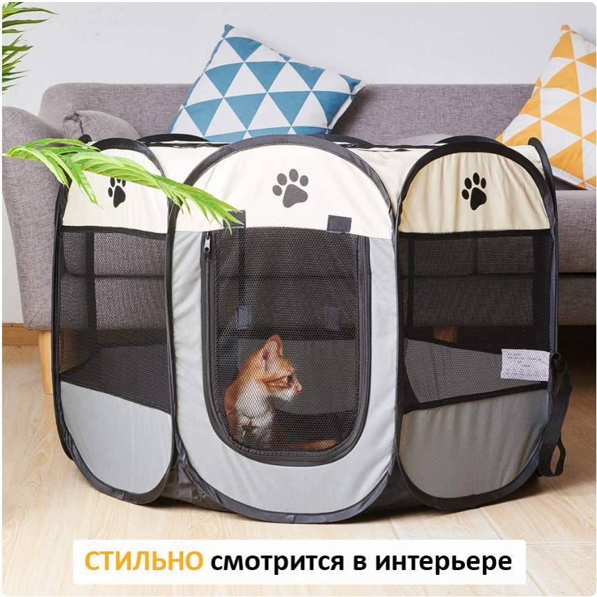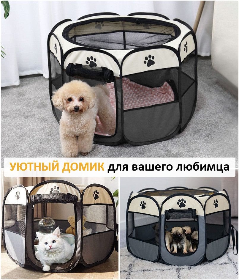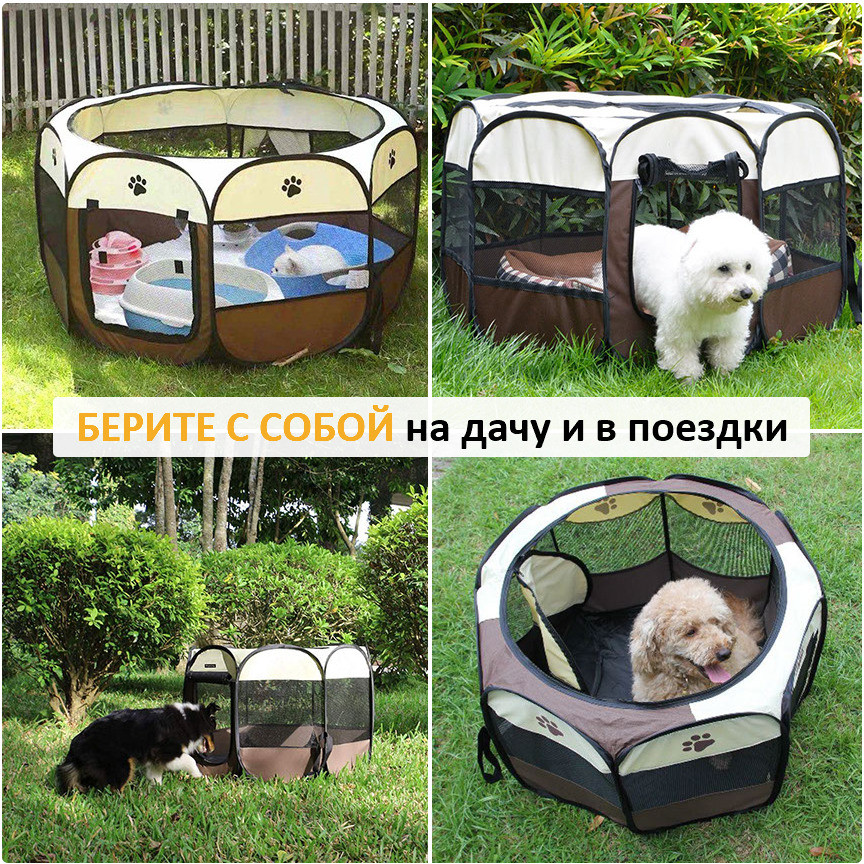 Тентовый вольер изготовлен из прочного водонепроницаемого материала, прекрасно подойдет для дома и улицы. Крыша сделана из прочной сетки, пристегивается на молнию. В одной из секций дверь. Домик-манеж для собак, щенков, кошек, кроликов, шиншилл выполнен из прочного материала, незаменим в путешествии, дома или на улице. Устанавливается за считанные секунды и не требует сборки. Вольер оснащен одним входом, закрывающимися на застежку-молнию. Сверху на застежку-молнию пристегивается сетчатая крыша. Этот портативный манеж позволяет легко брать вашего питомца с собой, куда бы вы ни отправились. |