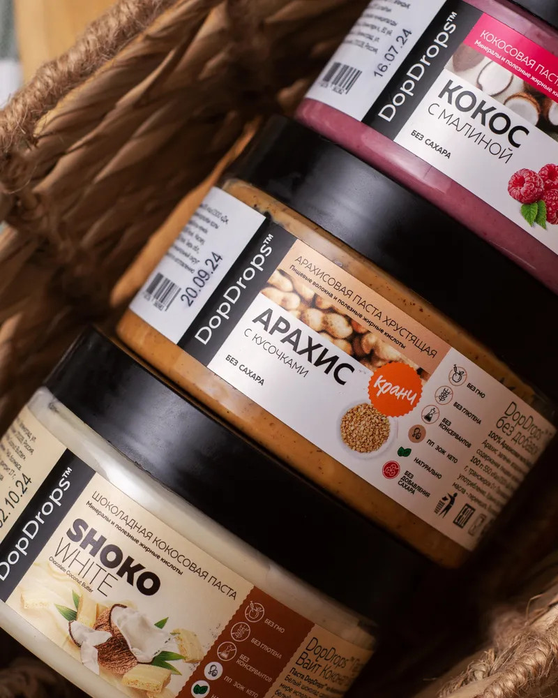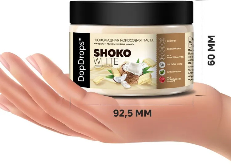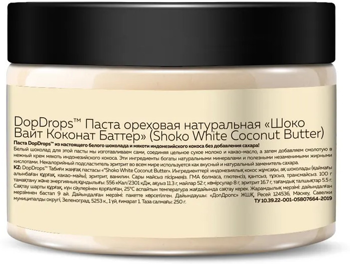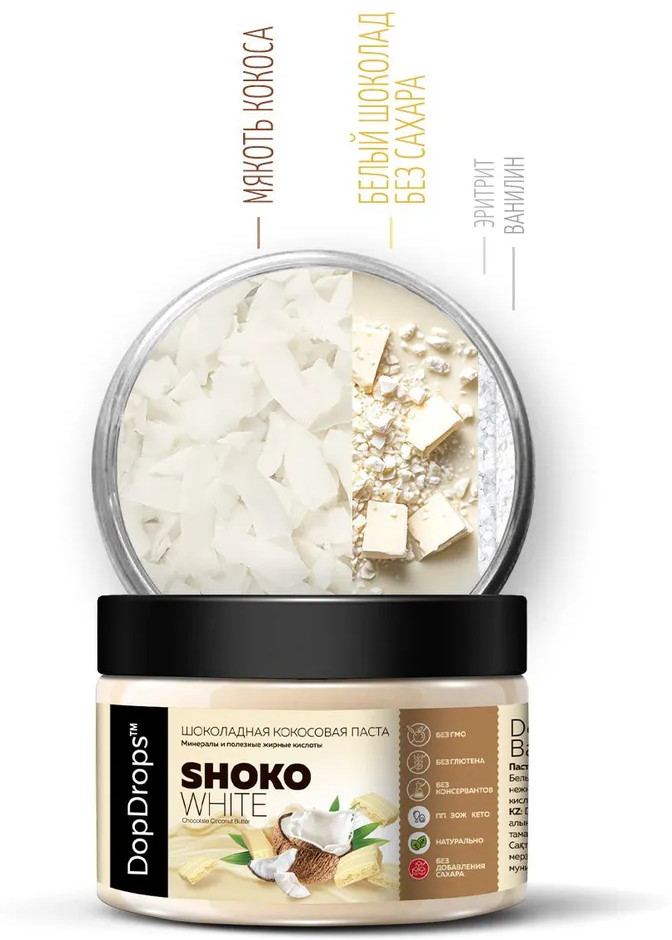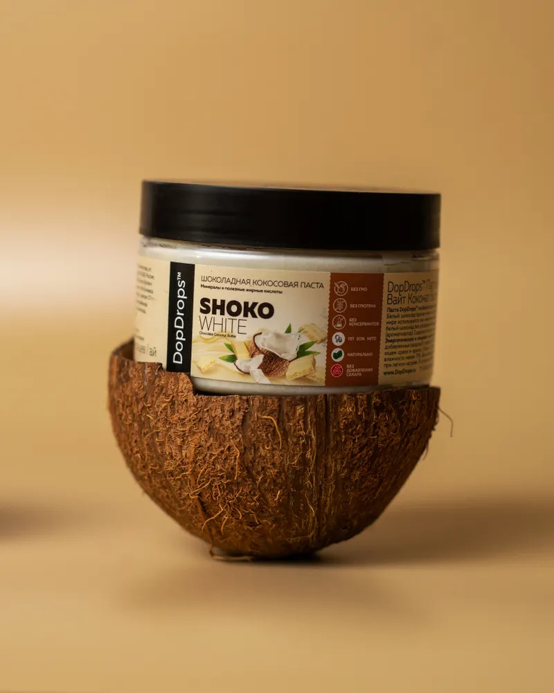 Натуральная кокосовая паста DopDrops с настоящим белым шоколадом без добавления сахара — это изысканный десерт и полезный продукт для всей семьи, который зарядит энергией на целый день.