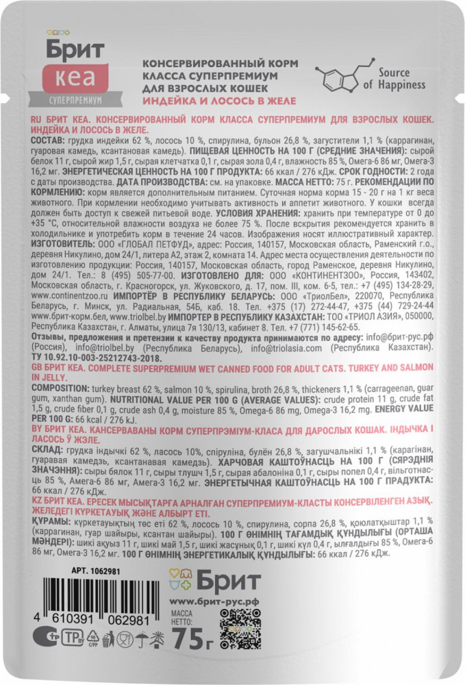 Brit Корм влажный для взрослых кошек «Индейка и лосось в желе»