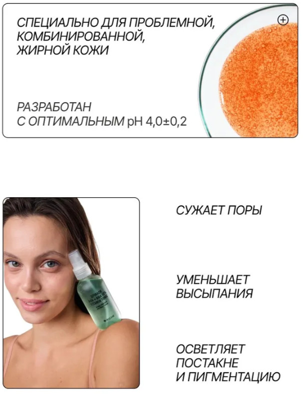 Жирная, комбинированная кожа часто сталкивается с расширенными порами, высыпаниями и неровным тоном. Повышенная выработка себума, замедленное обновление клеток и воздействие внешних факторов могут приводить к воспалениям,прыщам и постакне. Важно не только очищать её, но и стимулировать обновление. Кислотный тоник от RICHE LAABS (Рише) с AHA/BHA кислотами обеспечивает комплексное действие. AHA-кислоты мягко отшелушивают омертвевшие клетки, осветляют пигментацию и улучшают текстуру кожи. BHA (салициловая кислота) растворяют излишки себума в порах, предотвращая появление комедонов и черных точек. В результате работы этого себорегулирующего тоника кожа становится более ровной и гладкой, поры выглядят менее заметными, воспаления уменьшаются, а тон лица выравнивается.