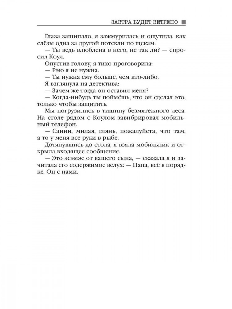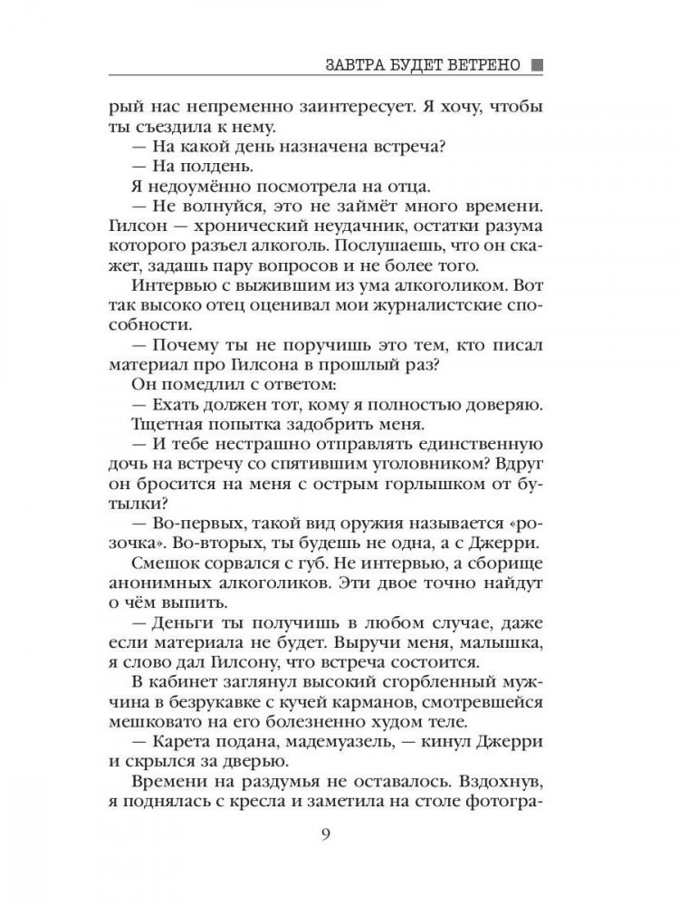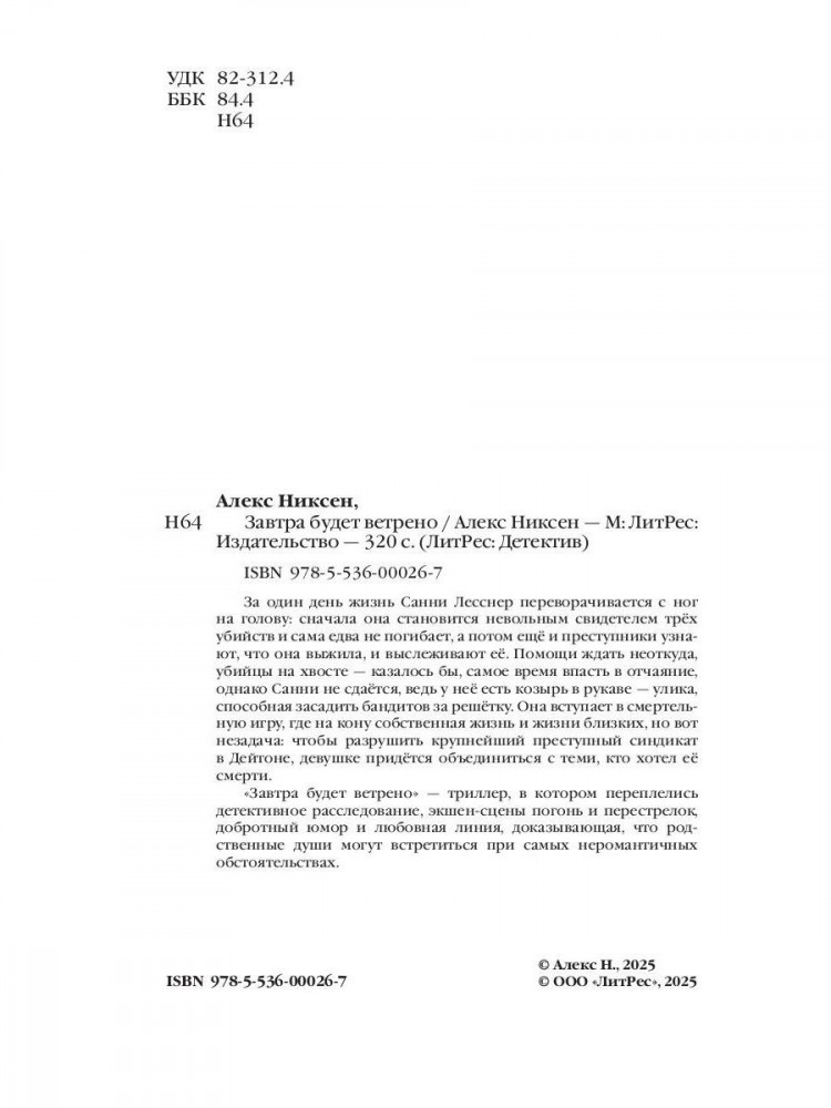 💳 Оплатить за товар можно при получении 🇰🇿 Есть бесплатная доставка по Казахстану 🎁 Копите бонусы с каждой покупки За один день жизнь Санни Лесснер переворачивается с ног на голову: сначала она становится невольным свидетелем трёх убийств и сама едва не погибает, а потом ещё и преступники узнают, что она выжила, и выслеживают её. Помощи ждать неоткуда, убийцы на хвосте — казалось бы, самое время впасть в отчаяние, однако Санни не сдаётся, ведь у неё есть козырь в рукаве — улика, способная засадить бандитов за решётку. Она вступает в смертельную игру, где на кону собственная жизнь и жизни близких, но вот незадача: чтобы разрушить крупнейший преступный синдикат в Дейтоне, девушке придётся объединиться с теми, кто хотел её смерти. «Завтра будет ветрено» — триллер, в котором переплелись детективное расследование, экшен-сцены погонь и перестрелок, добротный юмор и любовная линия, доказывающая, что родственные души могут встретиться при самых неромантичных обстоятельствах. |