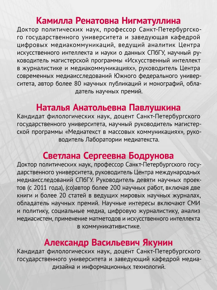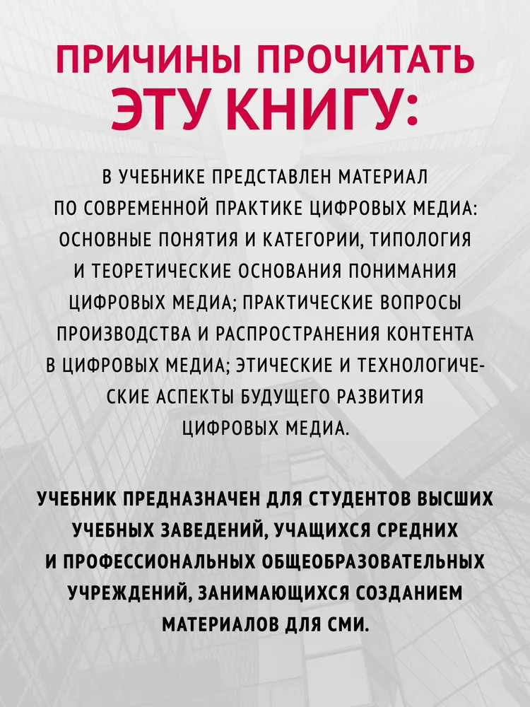 Серия: Учебник для вузов В учебнике представлен материал по современной практике цифровых медиа: основные понятия и категории, типология и теоретические основания понимания цифровых медиа; практические вопросы производства и распространения контента в цифровых медиа; этические и технологические аспекты будущего развития цифровых медиа. Учебник предназначен для студентов высших учебных заведений, учащихся средних и профессиональных общеобразовательных учреждений, занимающихся созданием материалов для цифровых медиа. |