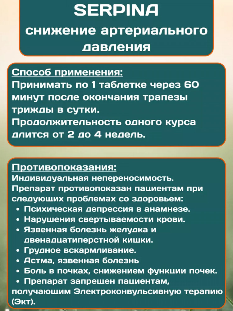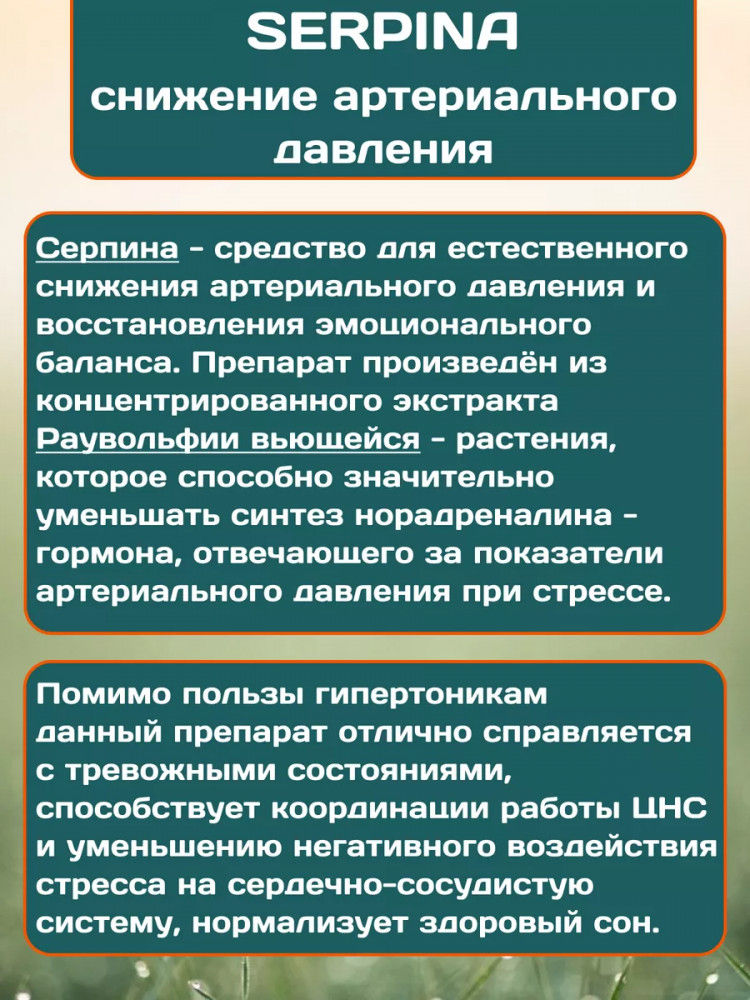 Серпина (Serpina) – это аюрведическая добавка, которая помогает избавиться от тревожных расстройств. Натуральные травы, содержащиеся в этом продукте, помогают восстановить нормальное кровяное давление.