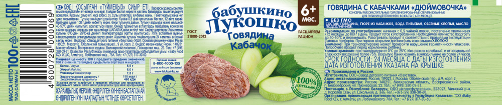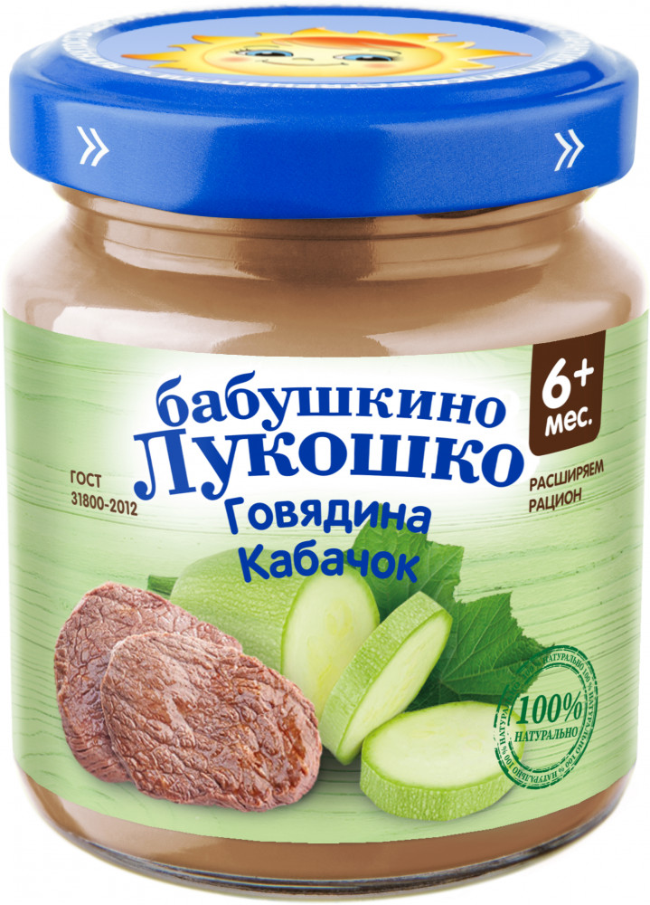 Пюре Бабушкино лукошко «Говядина с кабачком «Дюймовочка» для питания детей с 6 месяцев. Пюре из говядины с кабачком богато минеральными веществами (калием, кальцием, железом, магнием). Добавление овсяных хлопьев и растительного масла обогащает пюре углеводами и витамином Е.
