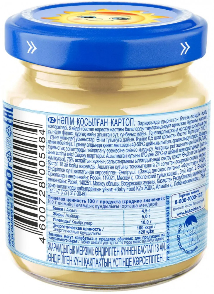 Пюре Бабушкино лукошко треска-картофель для детей с 8 месяцев 100 г. Треска содержит полиненасыщенные жирные кислоты (Омега3), большое количество витаминов (А, D, витамины группы В) и минеральных веществ (кальция, цинка, фосфора, калия и йода). Входящий в состав картофель обогащает пюре пищевыми волокнами. Без ГМО. Без добавления соли.