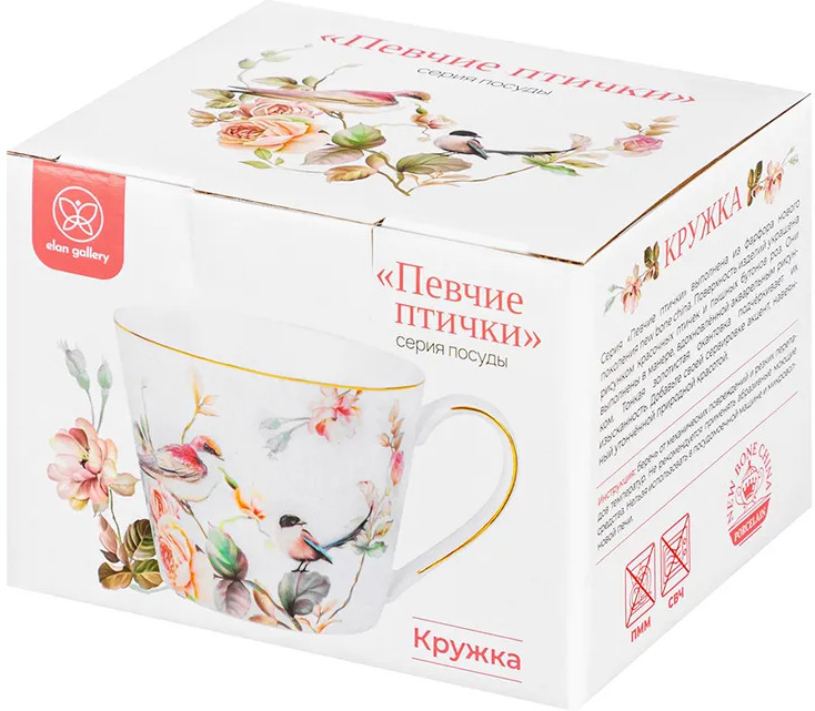 Серия: Певчие птички Кружка из серии «Певчие птички» от Elan Gallery предназначена для эстетичной сервировки вашего стола. Размер ёмкости — 13.5×10.5×8.5 см, объём — 420 мл. Выполнена из фарфора нового поколения new bone china, сочетающего в себе изящность и высокую прочность. Такие изделия легко отмываются, поэтому сохраняют привлекательный вид и практичны в использовании. От других видов костяного фарфора new bone china отличается большей экологичностью в производстве. Изделие украшено рисунком пёстрых птичек и пышных бутонов роз. Они выполнены в манере, вдохновлённой акварельным рисунком. Тонкая золотистая окантовка служит деликатным акцентом и подчёркивает их изысканность. Кофейная кружка поможет вам провести множество приятных завтраков с капучино и латте, а также уютные чайные вечера с конфетами, вафлями, другими десертами и сладостями. |
