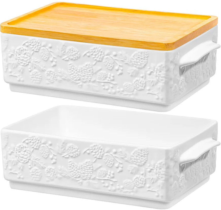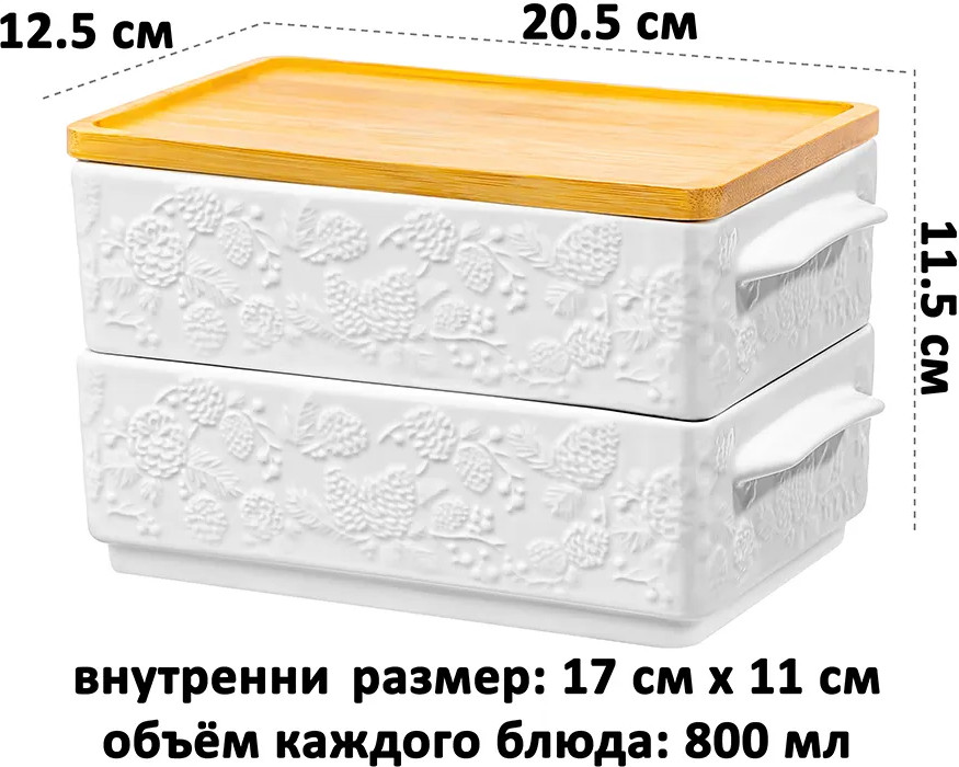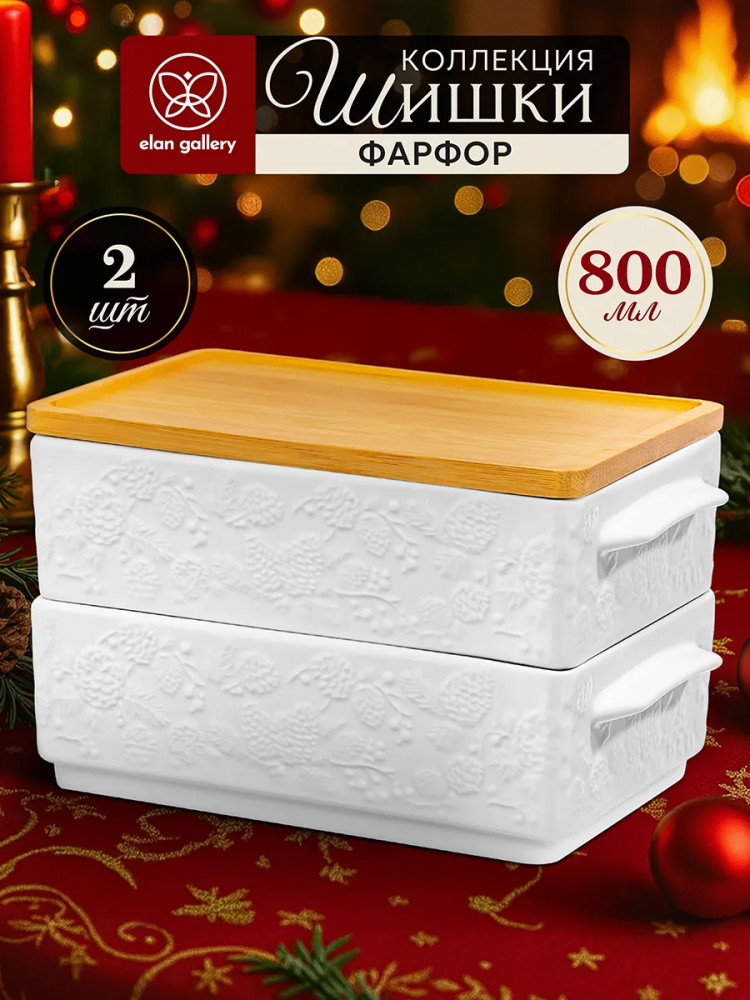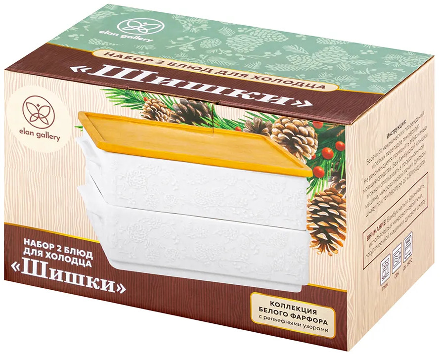 Набор Elan Gallery «Шишки» состоит из 2 прямоугольных блюд для холодца по 800 мл с бамбуковой крышкой (подставкой). Общий размер набора 20.5×12.5×11.5 см, размер каждого блюда без крышки 20.5×11.5×5.6 см. Формы выполнены из фарфора. Можно хранить друг на друге: верхнее будет крышкой для нижнего. Внутренний размер каждого — 17×11 см. «Шишки» — это коллекция фарфоровой посуды, вдохновлённая атмосферой хвойного леса. Белоснежная поверхность изделий украшена утончённым рельефом веточек и шишек. Мы создали коллекцию новогодних и рождественских товаров для сервировки и декора, которые наполнят пространство атмосферой уюта. Изделия помогут оформить интерьер праздничными композициями и добавят нотку зимнего волшебства. Подойдут для подачи сельди под шубой, салатов или плова. Селёдка под шубой — популярное блюдо на праздничном столе, используйте в роли шубницы и угостите им близких и гостей. Можно приспособить как салатник или глубокое сервировочное блюдо для закусок из мяса и рыбы.