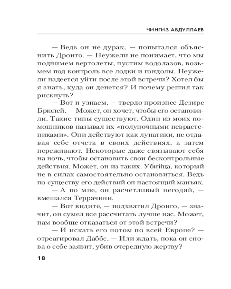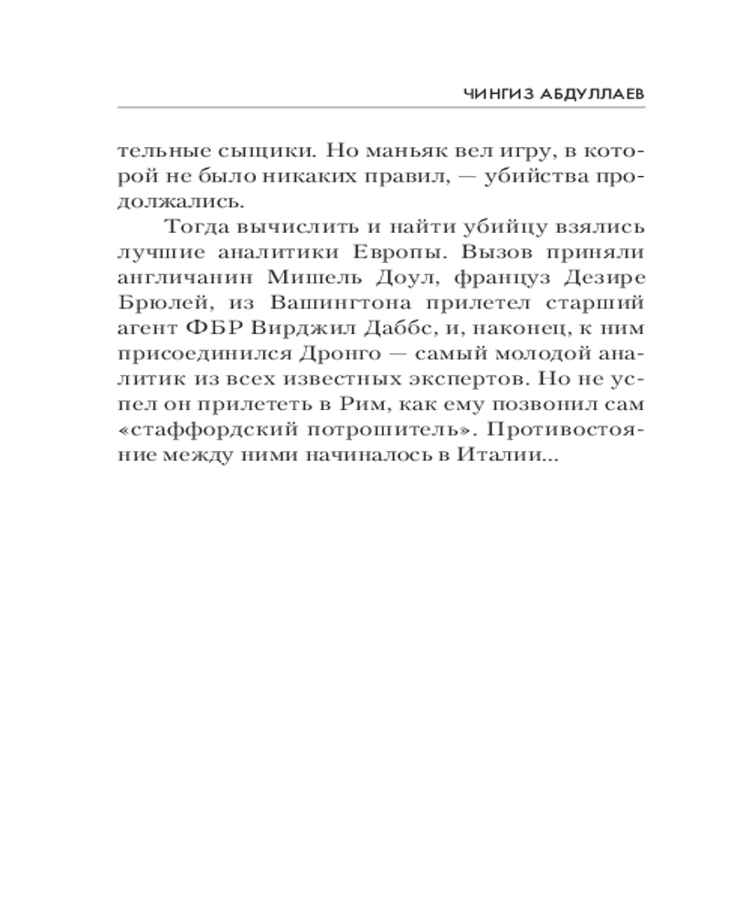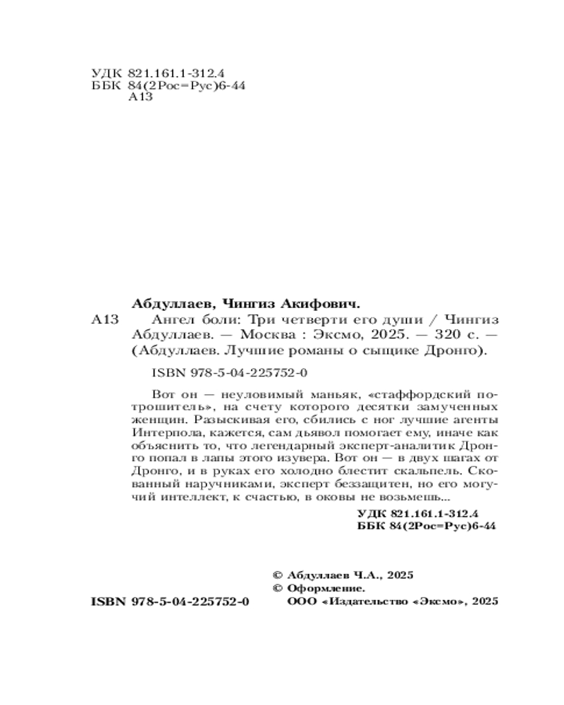 Ангел боли. Три четверти его душиВ данный момент этот товар отсутствует в продаже. Возможно, у нас найдется аналогичный или похожий товар здесь. Серия: Абдуллаев. Лучшие романы о сыщике Дронго. Эконом (обложка) Вот он — неуловимый маньяк, «стаффордский потрошитель», на счету которого десятки замученных женщин. Разыскивая его, сбились с ног лучшие агенты Интерпола, кажется, сам дьявол помогает ему, иначе как объяснить то, что легендарный эксперт-аналитик Дронго попал в лапы этого изувера. Вот он — в двух шагах от Дронго, и в руках его холодно блестит скальпель. Скованный наручниками эксперт беззащитен, но его могучий интеллект, к счастью, в оковы не возьмешь... |