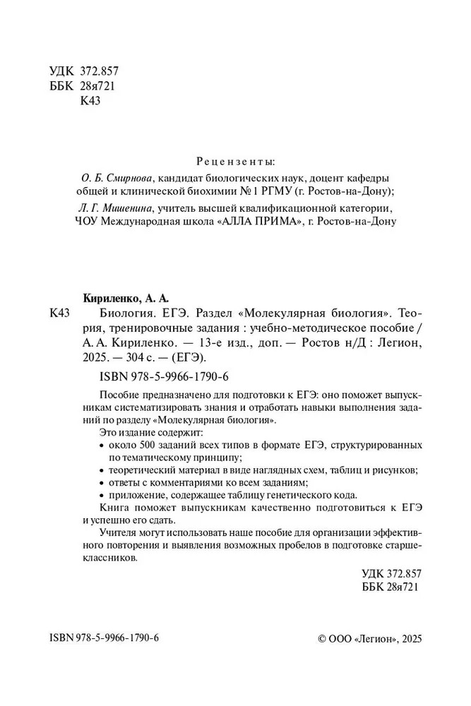 Пособие предназначено для подготовки к ЕГЭ: оно поможет выпускникам систематизировать знания и отработать навыки выполнения заданий по разделу «Молекулярная биология».
