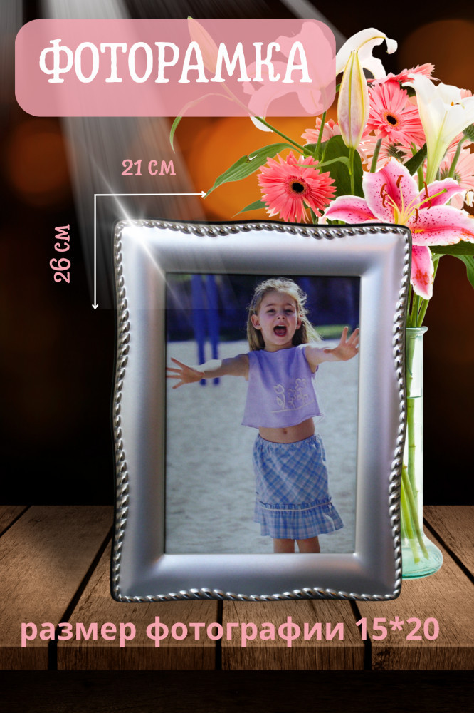 Элегантная фоторамка 26×21 см (фотография 15×20 см), стильное и универсальное украшение интерьера, которое поможет сохранить самые теплые воспоминания. Выполнена из прочного пластика «под серебро» с изящным витым кантом по краю, что придает изделию утонченный вид и делает его гармоничным элементом в классическом и современном интерьере. Рамка для фото оснащена прозрачным стеклом, которое надежно защищает от влаги и пыли. С обратной стороны плотная основа с бархатным покрытием. Конструкция позволяет устанавливать рамку как в вертикальном, так и в горизонтальном положении. Такая рамка настольная станет отличным подарком на любой праздник и прекрасно впишется в интерьер спальни, гостиной или офиса.