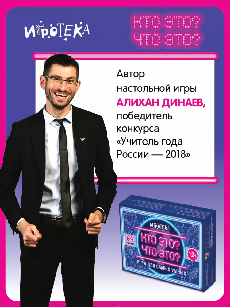 Увлекательная игра «Кто это? Что это?» создана победителем конкурса «Учитель года России – 2018» Алиханом Динаевым. Игра развивает креативность, коммуникативные навыки, логическое мышление, расширяет кругозор. На 64 игровых карточках дается пять подсказок о разных событиях, личностях, животных и предметах. Участники игры отгадывают слова, набирают очки, соревнуются поодиночке или командами.
