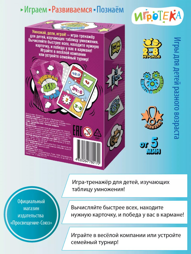 💳 Оплатить за товар можно при получении 🇰🇿 Есть бесплатная доставка по Казахстану 🎁 Копите бонусы с каждой покупки Игра-тренажер для детей, изучающих таблицу умножения. Вычисляйте быстрее всех, находите нужную карточку, и победа у вас в кармане! Играйте в веселой компании или устройте семейный турнир. |