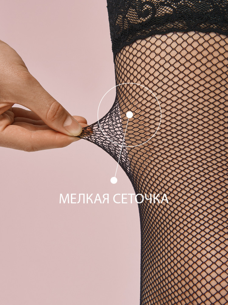 Эластичные чулки в сеточку с изысканной кружевной каймой на силиконовой основе создают эффект безупречной посадки и надежной фиксации, подчеркивая красоту и стройность ног. Легкие и комфортные, они идеально подходят для романтических образов и вечерних нарядов, сочетая элегантность, практичность и утонченную женственность в каждом движении. Эти чулки дарят ощущение уверенности и изящества, оставаясь незаметными под одеждой и обеспечивая комфорт на протяжении всего дня.