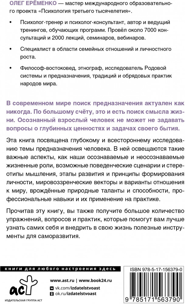 Книга «Смысл жизни: как найти свое предназначение» посвящена глубокому и всестороннему исследованию темы предназначения человека. В ней освещаются такие важные аспекты, как наши осознаваемые и неосознаваемые жизненные роли, возможные поведенческие сценарии и стереотипы мышления, этапы развития и принципы формирования личности, мировоззренческие векторы и варианты отношения к миру, врождённые природные таланты и способности, профессиональные навыки и их применение на практике.