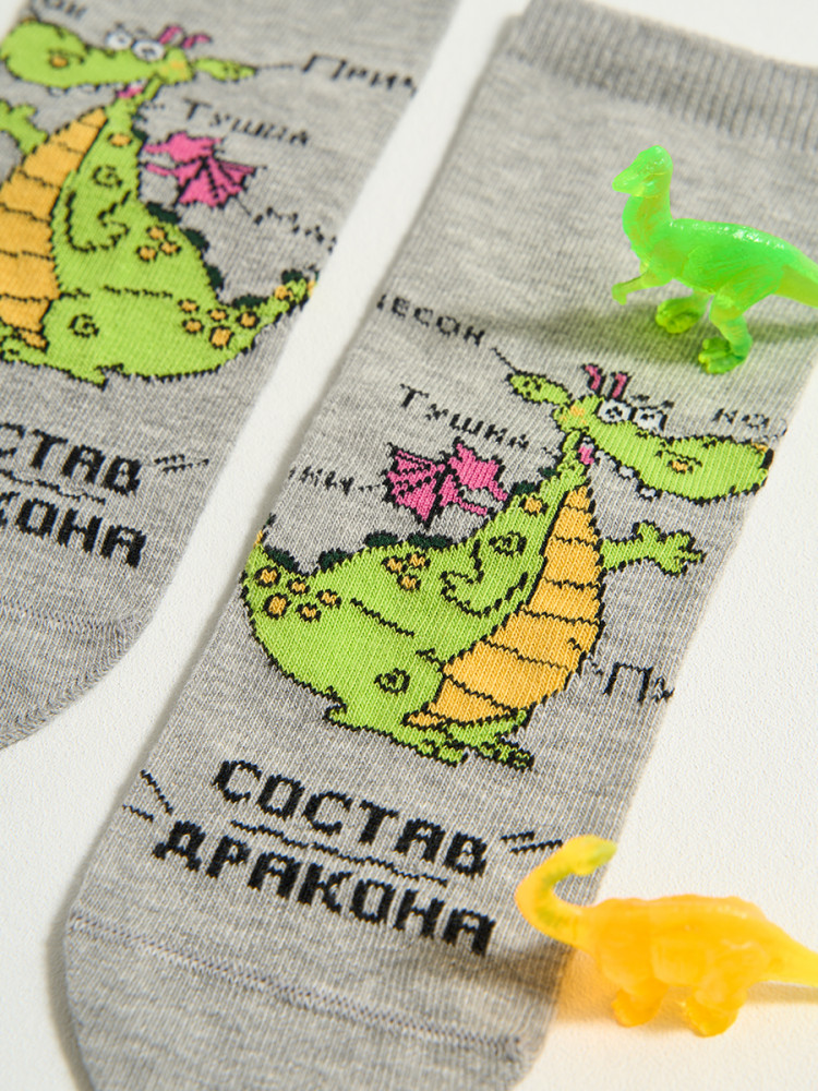 Детские универсальные носки с рисунком в виде яркого дракона. Изготовлены из высококачественного хлопка, который отлично пропускает воздух и впитывает влагу, приятен на ощупь и подходит даже для чувствительной детской кожи. Удобная мягкая резинка и кеттельный (плоский) шов на мыске обеспечивают максимальный комфорт. Превосходно облегают, обладают повышенной износостойкостью, сохраняют форму и насыщенность цвета после стирок. Соответствуют гигиеническим требованиям для детской продукции.
