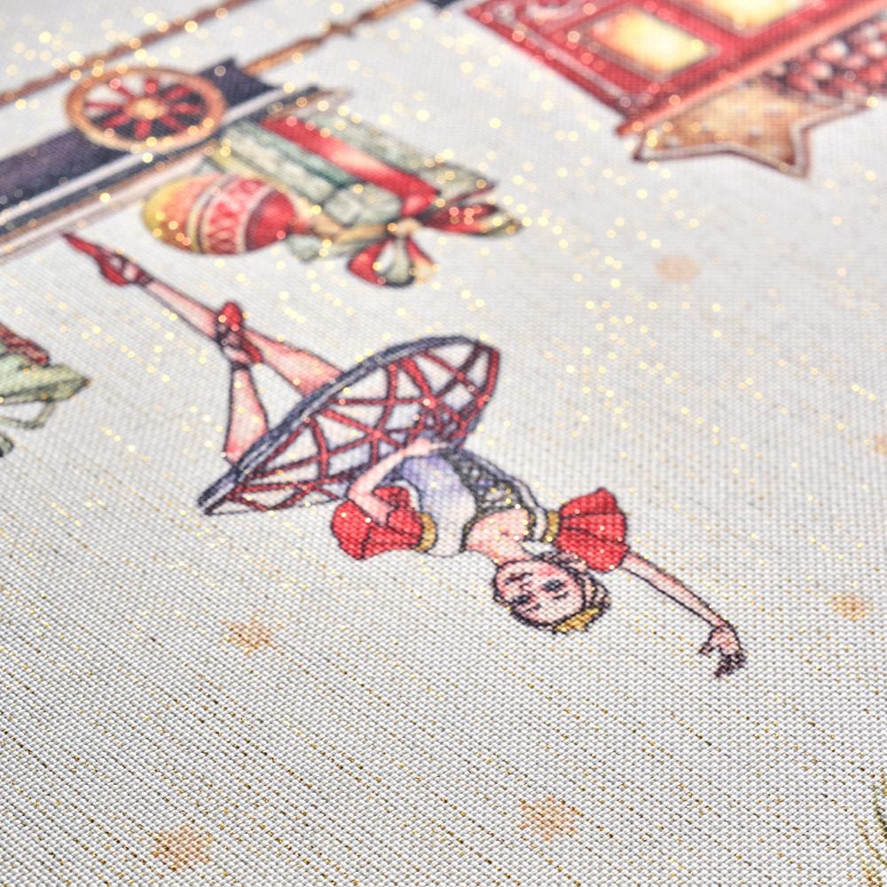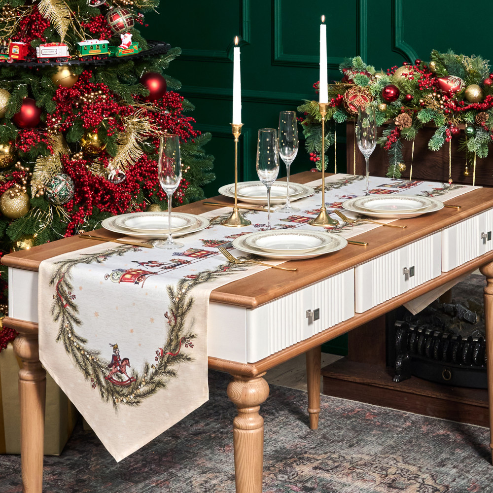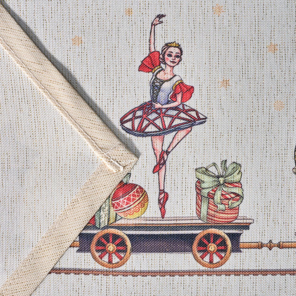 Эта праздничная дорожка гармонично сочетается с посудой, свечами и новогодними украшениями, создавая законченный образ праздничной композиции. Принт вдохновлён рождественской сказкой «Щелкунчик». На ткани оживают еловые ветви, праздничные игрушки и изящные декоративные элементы, выполненные методом цифровой печати. Рисунок отличается глубиной цвета и безупречной чёткостью линий, оставаясь ярким и выразительным даже после множества стирок.