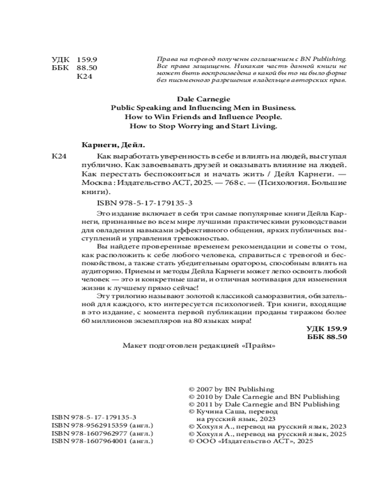 💳 Оплатить за товар можно при получении 🇰🇿 Есть бесплатная доставка по Казахстану 🎁 Копите бонусы с каждой покупки Серия: Психология. Большая книга Устали от бесконечных тревог, которые мешают вам жить полной жизнью? Мечтаете об отношениях, где вас ценят и уважают, а ваши слова имеют вес? Жаждете обрести ту самую уверенность, которая позволит вам блистать в любой компании и покорять аудитории? Перед вами сборник, объединивший три фундаментальные работы мастера человеческих отношений! Это не просто книги, это ваши персональные ключи к миру, где вы управляете своим спокойствием, строите прочные связи и уверенно заявляете о себе. |