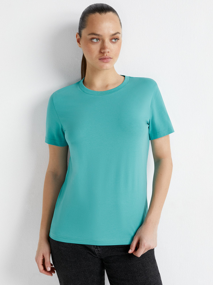 Женская футболка с коротким рукавом. В составе — высококачественный хлопок, который обладает отличной воздухопроницаемостью, хорошо впитывает влагу и подходит даже для чувствительной кожи, и эластан, который позволяет создать полуприлегающий силуэт и способствует длительному сохранению формы и цвета. Удобная, легкая и стильная. Благодаря прямому крою и свободному силуэту эффектно смотрится независимо от типа фигуры, обеспечивает свободу движений, и подходит как для занятий спортом, так и на каждый день.