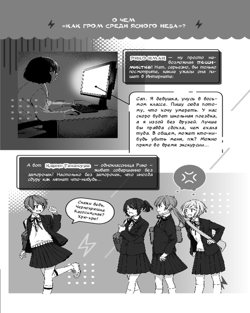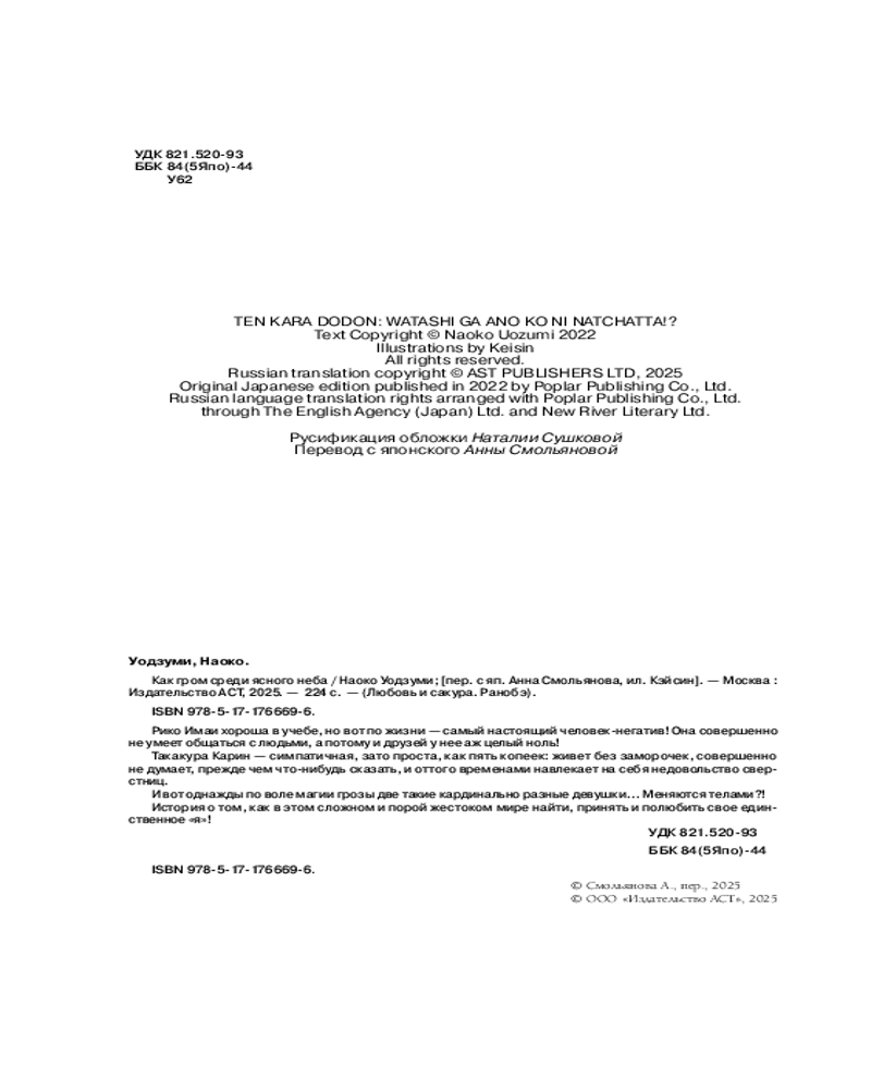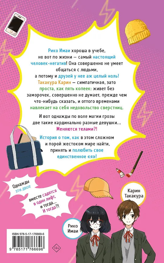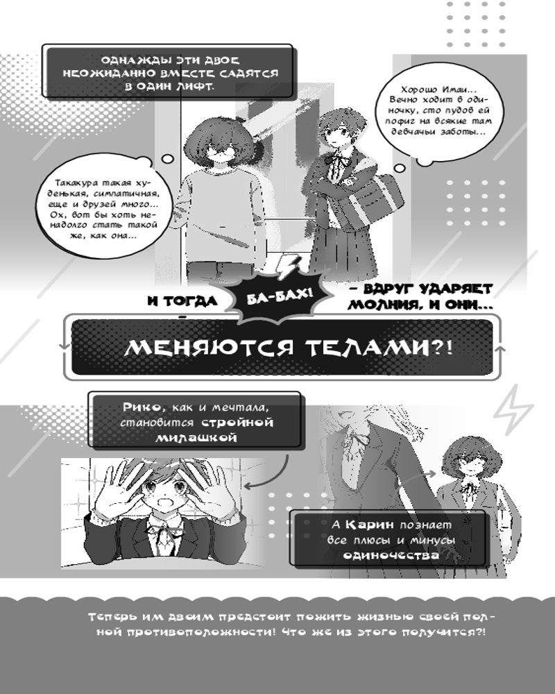 Серия: Любовь и сакура. Ранобэ Рико Имаи хороша в учёбе, но вот по жизни — самый настоящий человек-негатив! Она совершенно не умеет общаться с людьми, а потому и друзей у неё аж целый ноль! Такакура Карин — симпатичная, зато проста, как пять копеек: живёт без заморочек, совершенно не думает, прежде чем что-нибудь сказать, и оттого временами навлекает на себя недовольство сверстниц. И вот однажды по воле магии грозы две такие кардинально разные девушки... Меняются телами?! История о том, как в этом сложном и порой жестоком мире найти, принять и полюбить своё единственное «я»! |