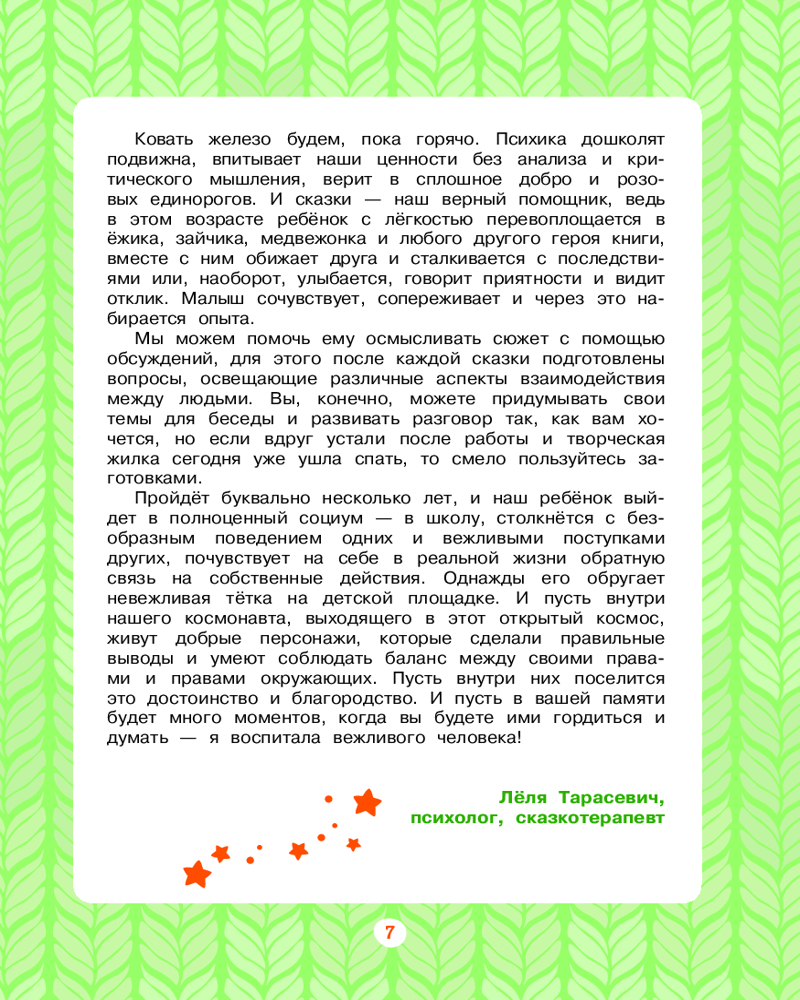 💳 Оплатить за товар можно при получении 🇰🇿 Есть бесплатная доставка по Казахстану 🎁 Копите бонусы с каждой покупки Серия: 7 сказок в помощь родителям В сборник вошли сказки С. Козлова, А. Барто, Г. Остера и других любимых детских писателей. Эти истории прошли проверку многими поколениями и обязательно помогут вашему малышу развить фантазию, речь, мышление и, конечно же, стать самыми вежливыми! |