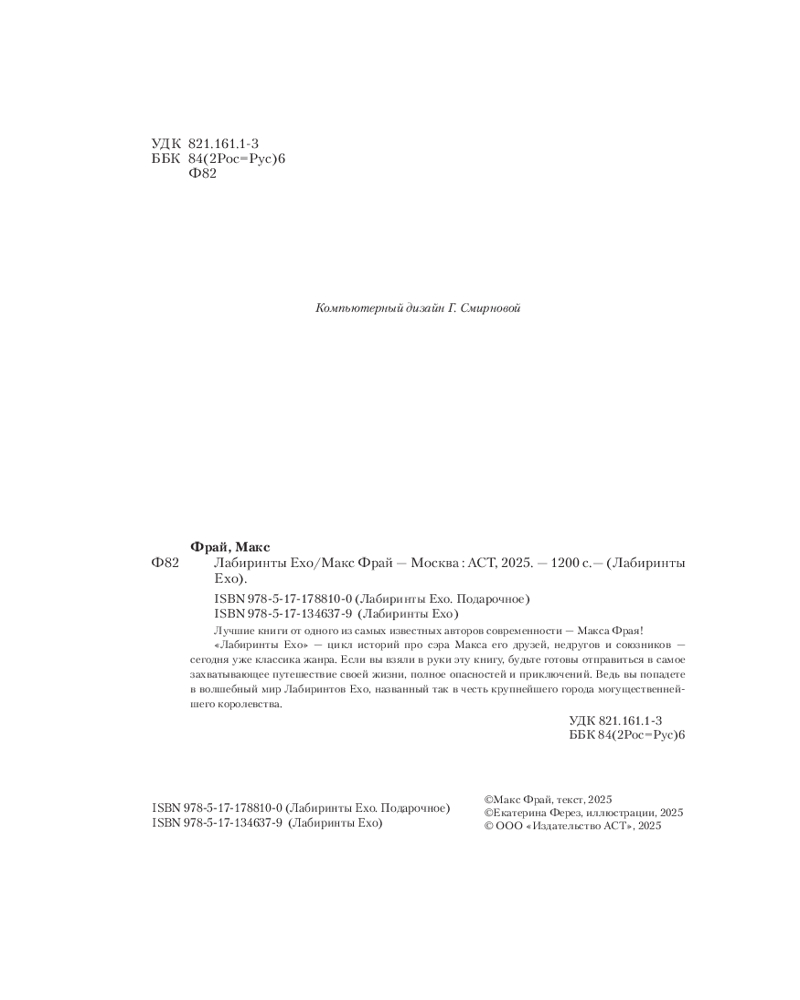 💳 Оплатить за товар можно при получении 🇰🇿 Есть бесплатная доставка по Казахстану 🎁 Копите бонусы с каждой покупки Серия: Ехо. Подарочное издание Лучшие книги от одного из самых известных авторов современности — Макса Фрая! «Лабиринты Ехо» — цикл историй про сэра Макса, его друзей, недругов и союзников — сегодня уже классика жанра. Если вы взяли в руки эту книгу, будьте готовы отправиться в самое захватывающее путешествие своей жизни, полное опасностей и приключений. Ведь вы попадете в волшебный мир Лабиринтов Ехо, названный так в честь крупнейшего города могущественнейшего королевства. |