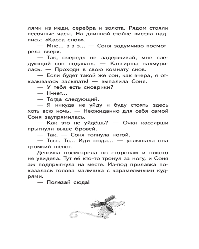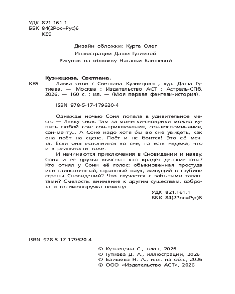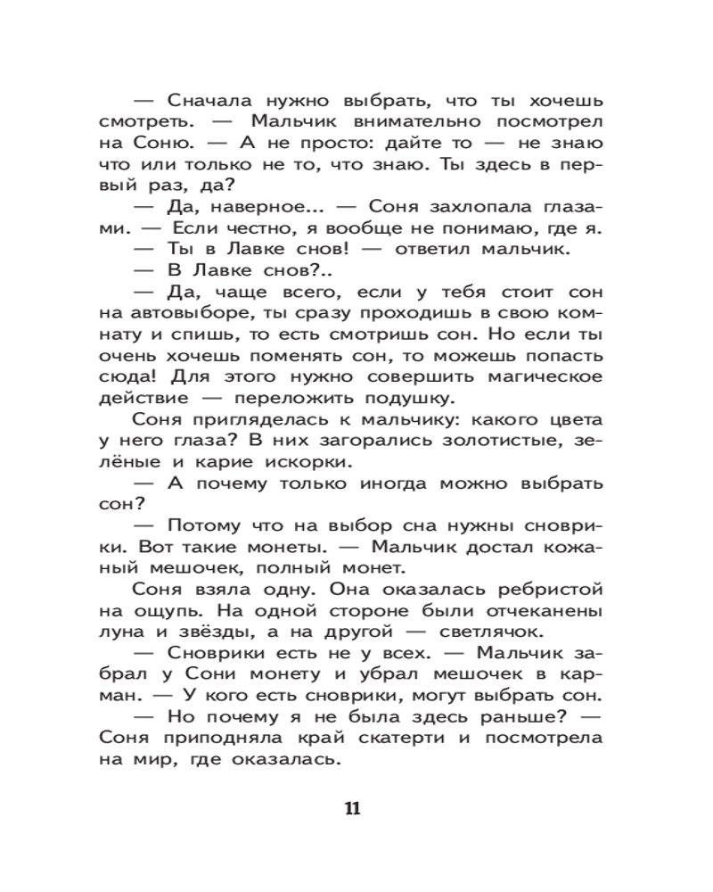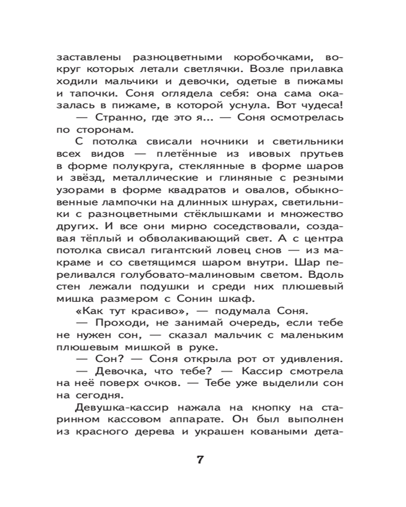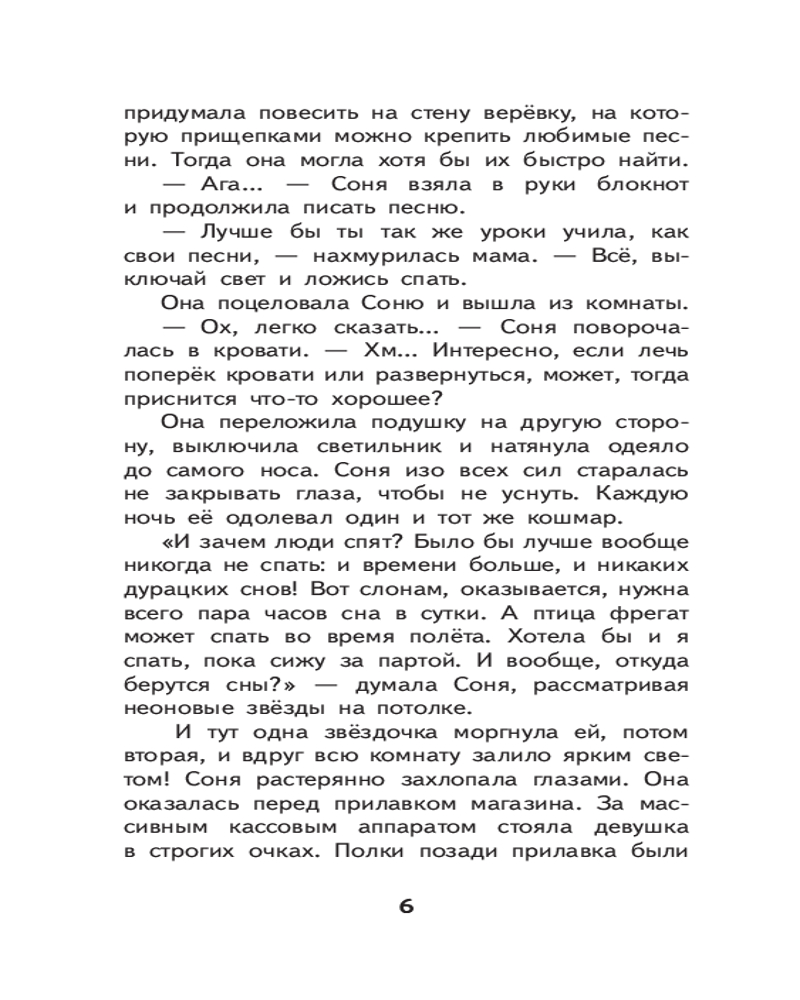 💳 Оплатить за товар можно при получении 🇰🇿 Есть бесплатная доставка по Казахстану 🎁 Копите бонусы с каждой покупки Серия: Моя первая фэнтези-история Однажды ночью Соня попала в удивительное место — Лавку снов. Там за монетки-сноврики можно купить любой сон: сон-приключение, сон-воспоминание, сон-мечту... А Соне надо хотя бы во сне увидеть, как она поёт на сцене. Поёт и не боится! Это её мечта. Если она исполнится во сне, то есть надежда, что и в реальности тоже. |