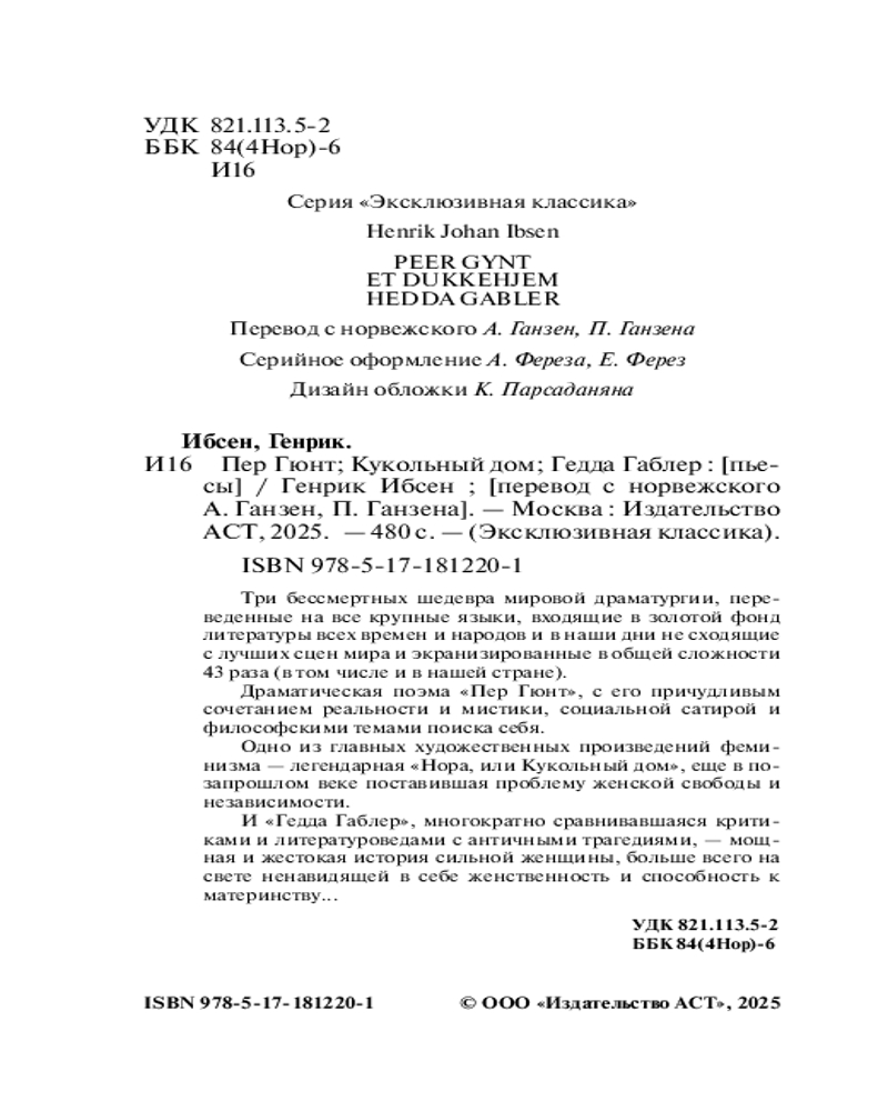 Три бессмертных шедевра мировой драматургии, переведенные на все крупные языки, входящие в золотой фонд литературы всех времен и народов и в наши дни не сходящие с лучших сцен мира и экранизированные в общей сложности 43 раза (в том числе и в нашей стране). Драматическая поэма «Пер Гюнт» с его причудливым сочетанием реальности и мистики, социальной сатирой и философскими темами поиска себя. Одно из главных художественных произведений феминизма — легендарная «Нора, или Кукольный дом», еще в позапрошлом веке поставившая проблему женской свободы и независимости. И «Гедда Габлер», многократно сравнивавшаяся критиками и литературоведами с античными трагедиями, — мощная и жестокая история сильной женщины, больше всего на свете ненавидящей в себе женственность и способность к материнству...