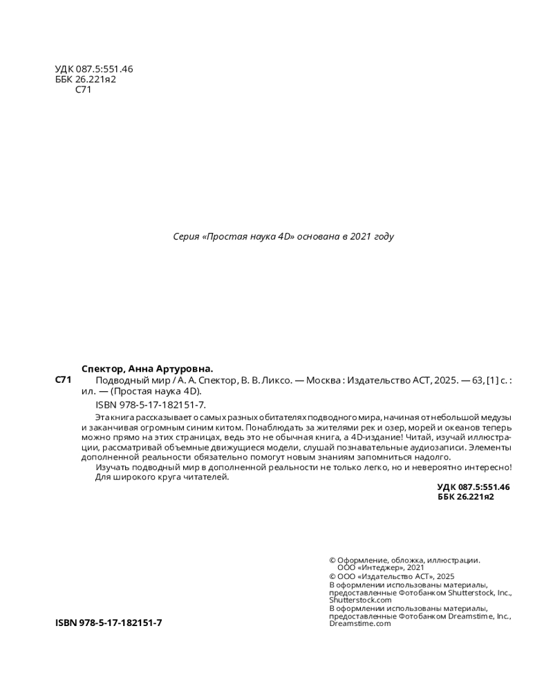 💳 Оплатить за товар можно при получении 🇰🇿 Есть бесплатная доставка по Казахстану 🎁 Копите бонусы с каждой покупки Серия: Простая наука 4D Эта книга рассказывает о самых разных обитателях подводного мира, начиная от небольшой медузы и заканчивая огромным синим китом. Понаблюдать за жителями рек и озер, морей и океанов теперь можно прямо на этих страницах, ведь эта не обычная книга, а 4D-издание! Читай, изучай иллюстрации, рассматривай объемные движущиеся модели, слушай познавательные аудиозаписи. Элементы дополненной реальности обязательно помогут новым знаниям запомниться надолго. Изучать подводный мир в дополненной реальности не только легко, но и невероятно интересно! |