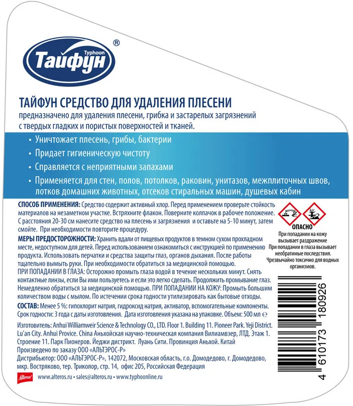 Способ применения: перед применением проверьте стойкость материалов на незаметном участке. Встряхните флакон. Поверните колпачок в рабочее положение. С расстояния 20-30 см нанесите средство на плесень и загрязнения и оставьте на 5-10 минут, затем смойте. При необходимости повторите процедуру.