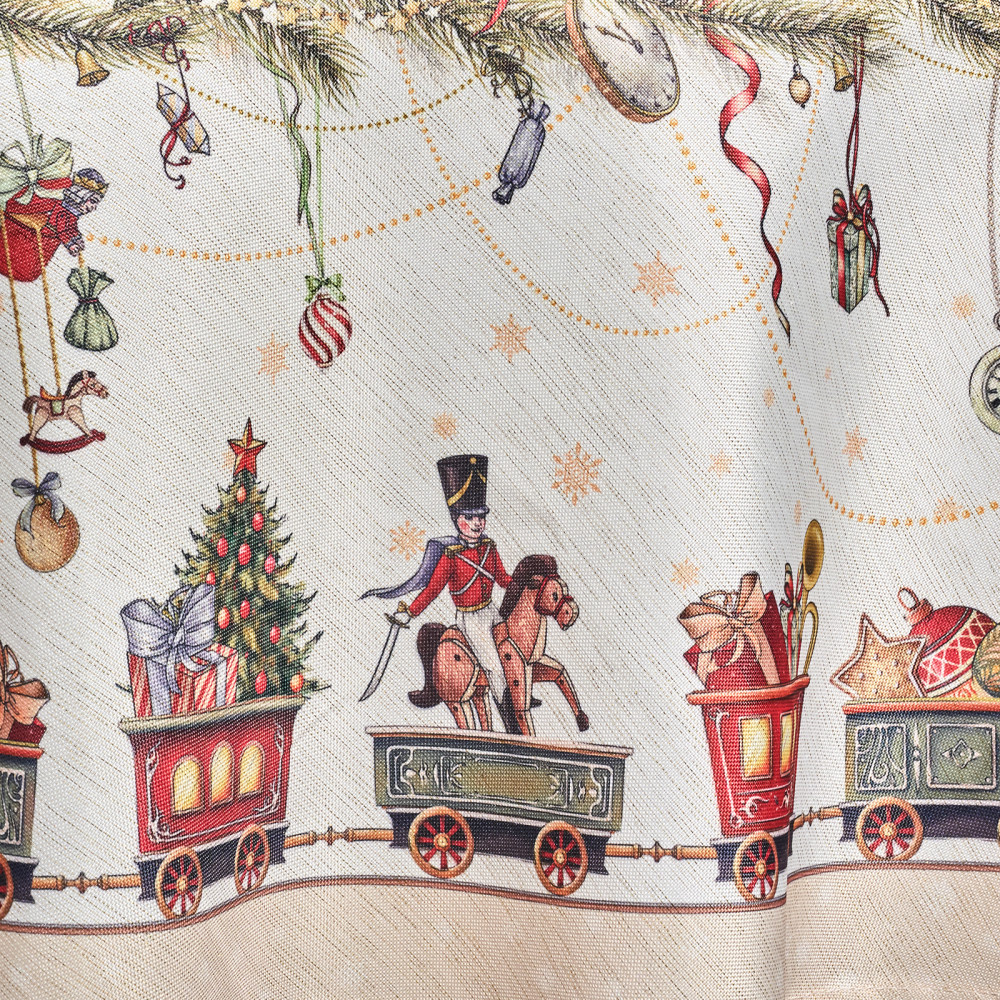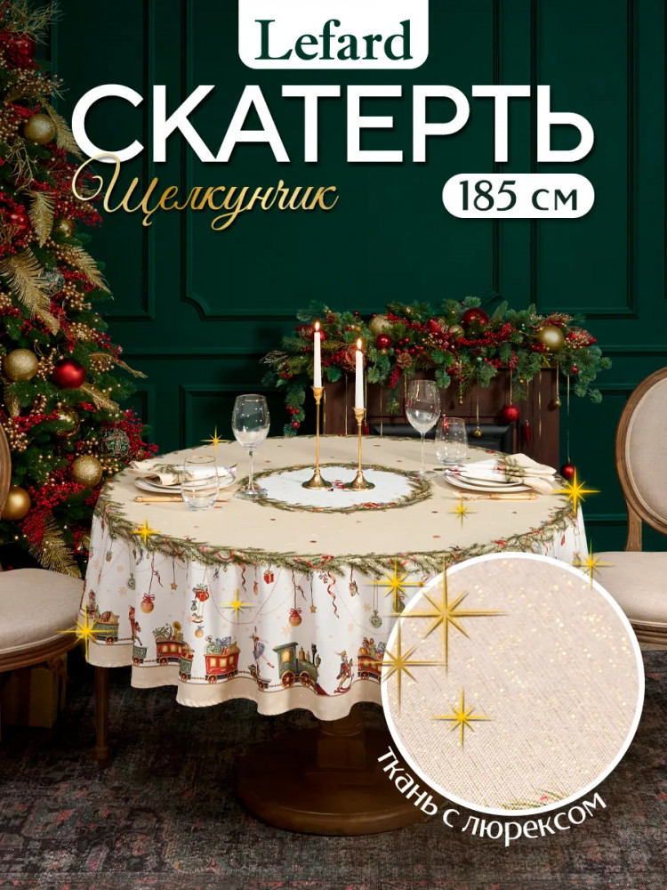 Новогодняя круглая скатерть на стол Lefard из коллекции «Щелкунчик» — изысканное украшение праздничного стола, создающее атмосферу тепла и волшебства. Круглая форма делает сервировку гармоничной и выразительной — такая скатерть идеально подходит для круглого стола и моментально настраивает на новогоднее настроение. Принт вдохновлён сказкой «Щелкунчик и Мышиный король»: в центре балерина и принц, по краю — рождественская композиция с игрушками, ёлочными гирляндами и миниатюрной железной дорогой. Эта скатерть словно сцена новогоднего спектакля — наполняет дом теплом и ожиданием праздника.