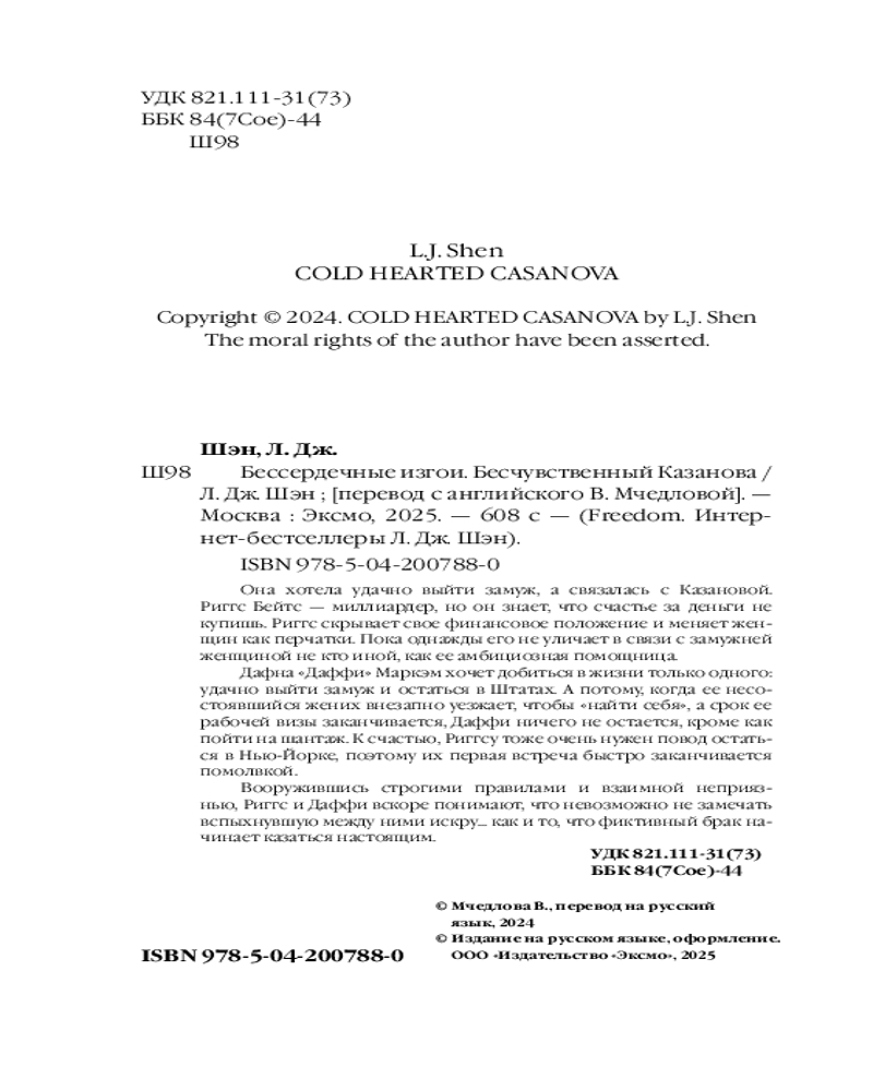 💳 Оплатить за товар можно при получении 🇰🇿 Есть бесплатная доставка по Казахстану 🎁 Копите бонусы с каждой покупки Серия: Freedom. Интернет-бестселлеры Л.Дж. Шэн Риггс Бейтс — миллиардер, но скрывает свое финансовое положение и меняет женщин как перчатки. Однажды его уличает в связи с замужней женщиной не кто иной, как его амбициозная помощница Дафна «Даффи» Маркэм. Личные обстоятельства толкают Даффи на шантаж. К счастью, Риггсу тоже очень нужен повод остаться в Нью-Йорке, поэтому их первая встреча быстро заканчивается помолвкой. Вскоре они понимают, что невозможно не заметить вспыхнувшую между ними искру... |