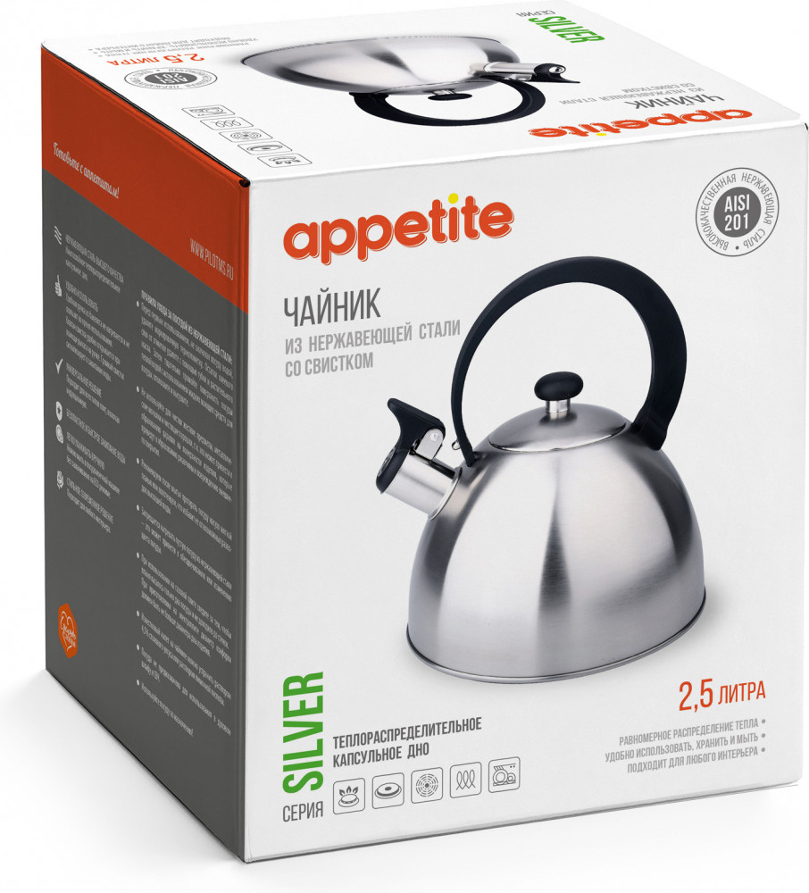 Чайник со свистком — практичный и удобный помощник для вашей кухни. Изготовлен из прочной нержавеющей стали, устойчивой к коррозии и повреждениям. Толщина корпуса 0,35 мм обеспечивает лёгкость и надёжность, а капсулированное дно 1,3 мм ускоряет нагрев и равномерно распределяет тепло. Чайник подходит для всех типов плит, включая индукционные, что делает его универсальным вариантом для любого дома. Со свистком, который подаст сигнал, когда вода закипит — удобно и безопасно. Идеальный выбор для ежедневного использования.
