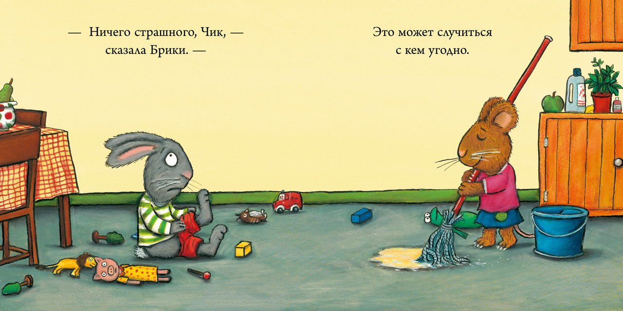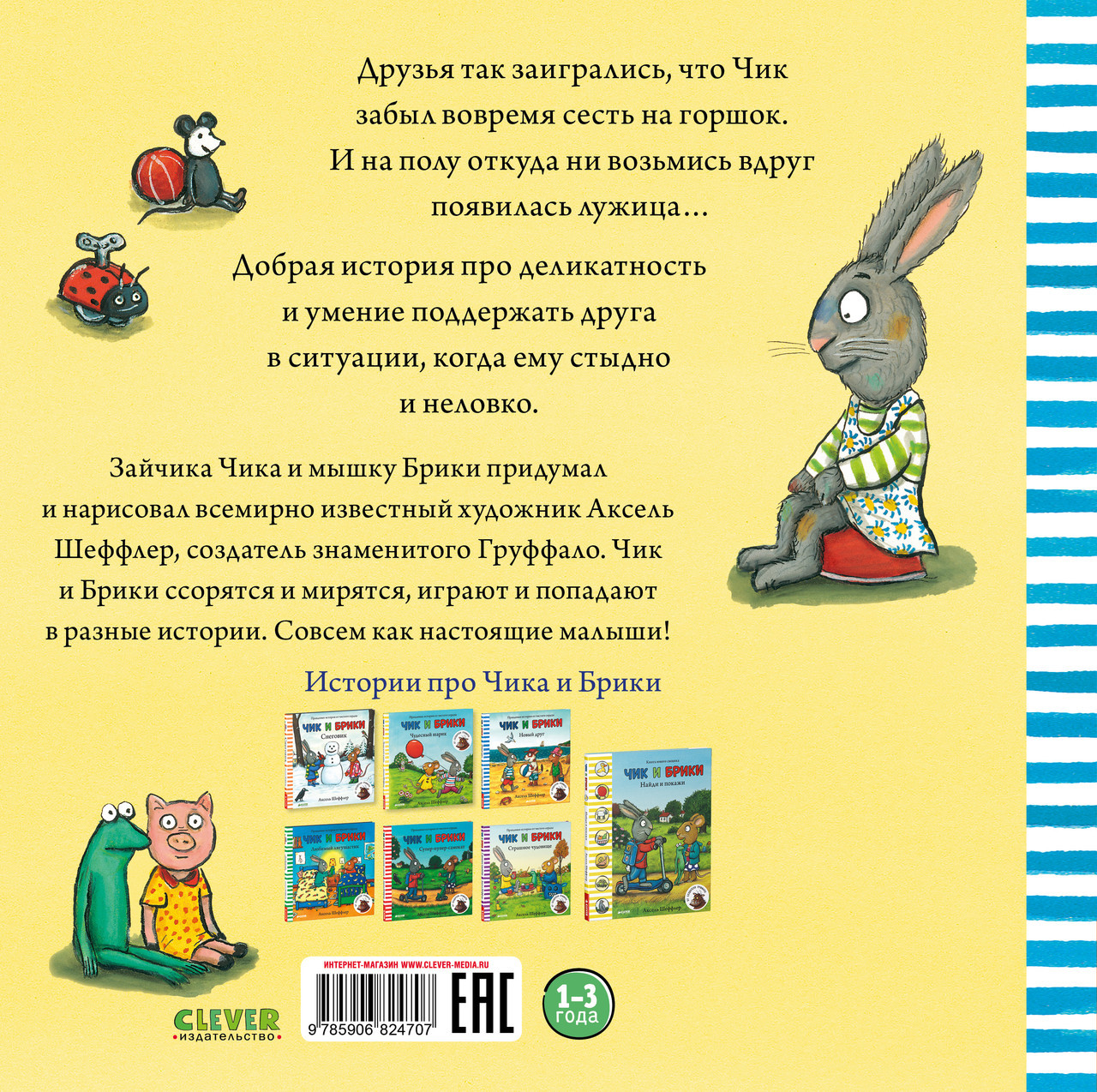 💳 Оплатить за товар можно при получении 🇰🇿 Есть бесплатная доставка по Казахстану 🎁 Копите бонусы с каждой покупки Друзья так заигрались, что Чик забыл вовремя сесть на горшок. И на полу откуда ни возьмись вдруг появилась лужица… Добрая история про деликатность и умение поддержать друга в ситуации, когда ему стыдно и неловко. Зайчика Чика и мышку Брики придумал и нарисовал всемирно известный художник Аксель Шеффлер, создатель знаменитого Груффало. Чик и Брики ссорятся и мирятся, играют и попадают в разные истории. Совсем как настоящие малыши! |