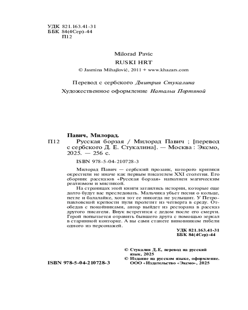 💳 Оплатить за товар можно при получении 🇰🇿 Есть бесплатная доставка по Казахстану 🎁 Копите бонусы с каждой покупки Серия: Магистраль. Балканская коллекция Милорад Павич — сербский прозаик, которого критики окрестили не иначе как первым писателем XXI столетия. Его сборник рассказов «Русская борзая» наполнен магическим реализмом и мистикой. На страницах этой книги затаились истории, которые еще долго будут вас преследовать. Мальчика убьет песня о кольце, петле и балалайке, хотя тот ее никогда не услышит. У Петропавловской крепости пуля пролетит из четверга в среду. Отобедав с покойниками, автор выйдет из ресторана в рассказ другого писателя. Внук встретится с дедом после его смерти. Герой попытается отравить бывшего друга с помощью зеркал в старинной конторке. А вы сами станете виновником гибели одного из персонажей. |