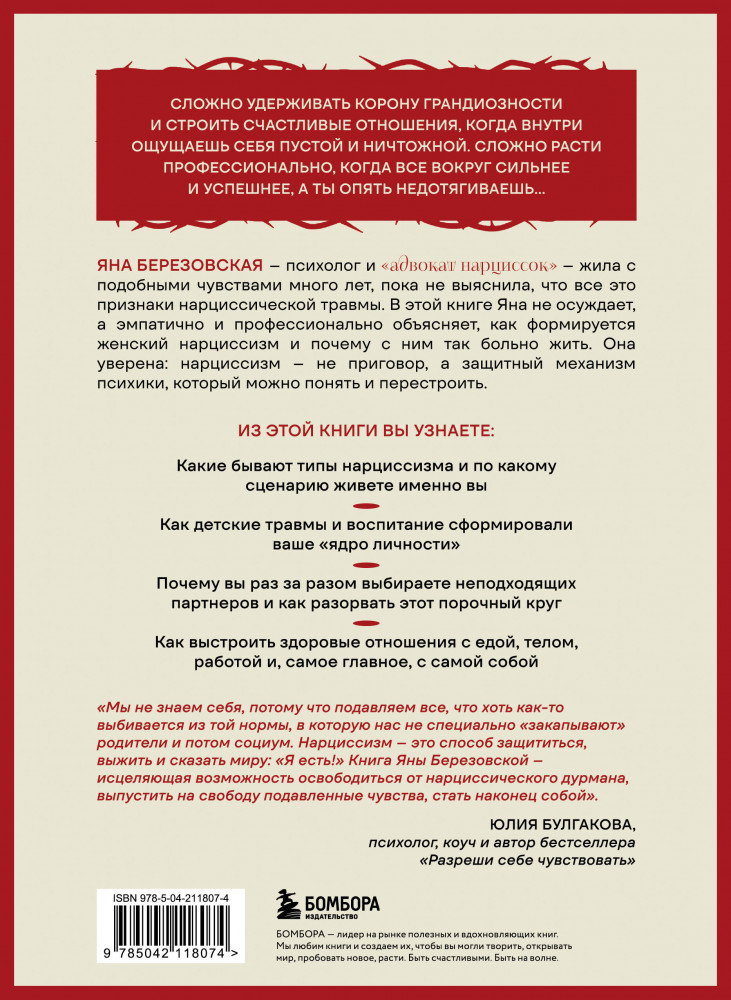 💳 Оплатить за товар можно при получении 🇰🇿 Есть бесплатная доставка по Казахстану 🎁 Копите бонусы с каждой покупки Серия: Top expert. Практичные книги для работы над собой Сложно удерживать корону грандиозности и строить счастливые отношения, когда внутри ощущаешь себя пустой и ничтожной. Сложно расти профессионально, когда все вокруг сильнее и успешнее, а ты опять не дотягиваешь... |