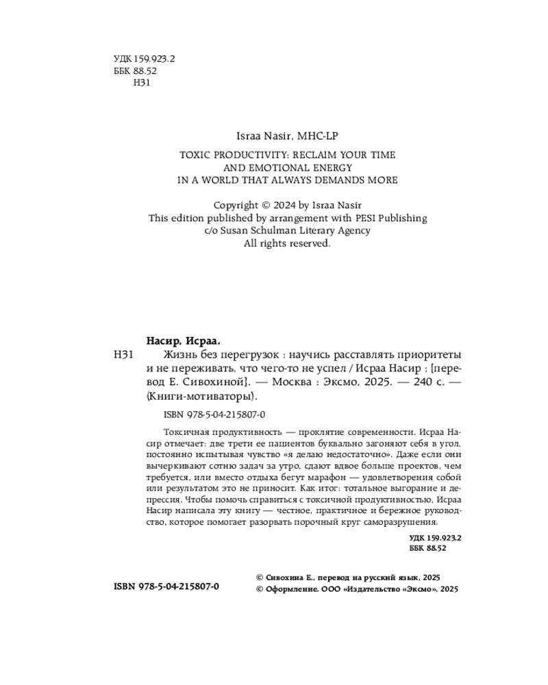 💳 Оплатить за товар можно при получении 🇰🇿 Есть бесплатная доставка по Казахстану 🎁 Копите бонусы с каждой покупки Серия: Книги-мотиваторы Токсичная продуктивность — проклятие современного мира. По наблюдениям психотерапевта Исраа Насира, от нее страдает как минимум две трети работающего населения. Люди изводят себя чувством вины за то, что делают недостаточно: не закрывают все сто пунктов из списка задач, пропускают важные письма, отвлекаются на сериалы или соцсети, когда могли бы работать на результат. Как итог: повальное выгорание, хронические депрессии и недовольство собой. Эта книга — бережное руководство по избавлению от токсичной продуктивности. В ней Исраа Насир исследует природу феномена и объясняет, как перестать быть его жертвой. |