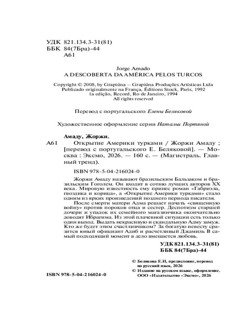 💳 Оплатить за товар можно при получении 🇰🇿 Есть бесплатная доставка по Казахстану 🎁 Копите бонусы с каждой покупки Серия: Магистраль. Главный тренд После смерти матери Адма решает начать «священную войну» против пороков отца и сестер. Деспотизм старшей дочери и упадок их семейного магазинчика окончательно доводят Ибрагима. Из этой плачевной ситуации есть только один выход. Выдать некрасивую и скандальную Адму замуж. Кто же будет этим счастливчиком? За богатую невесту сразятся юный официант Адиб и расчетливый Джамиль. В самый подходящий момент в дело вмешается любовь. |