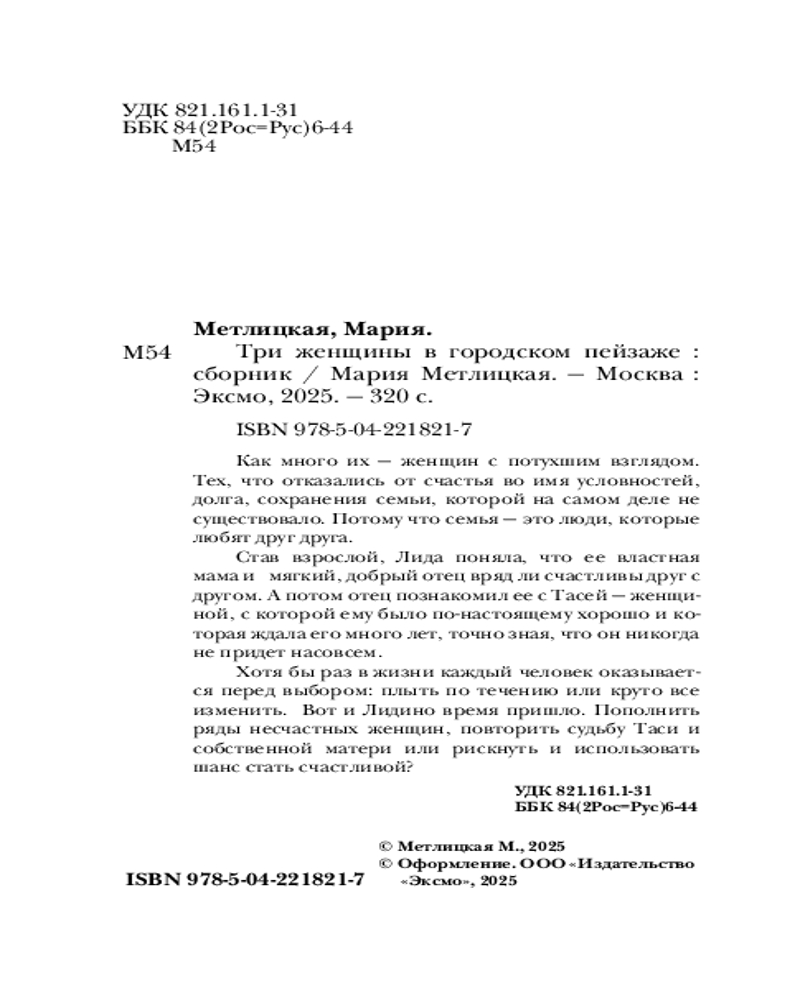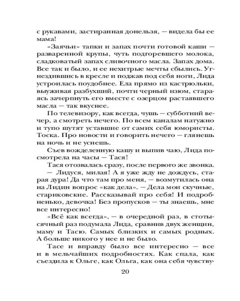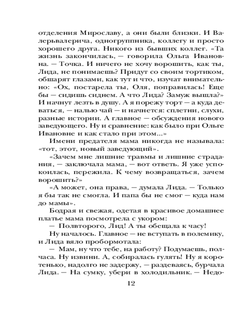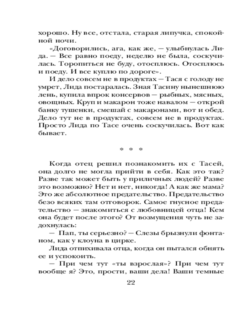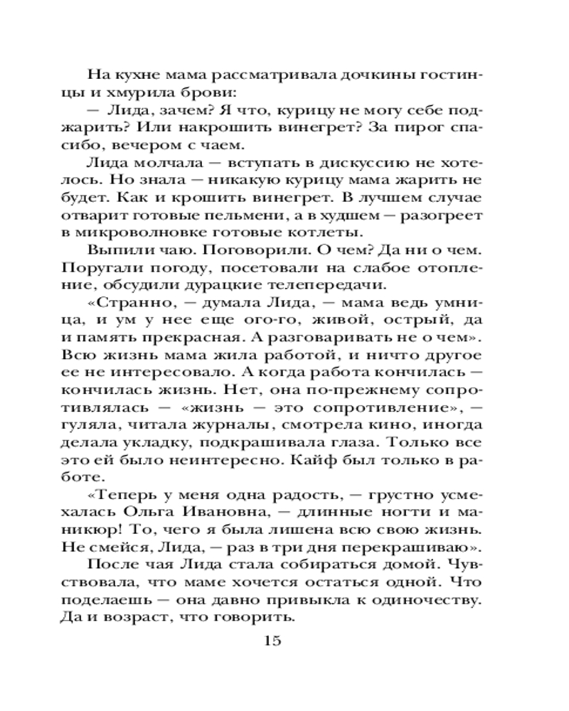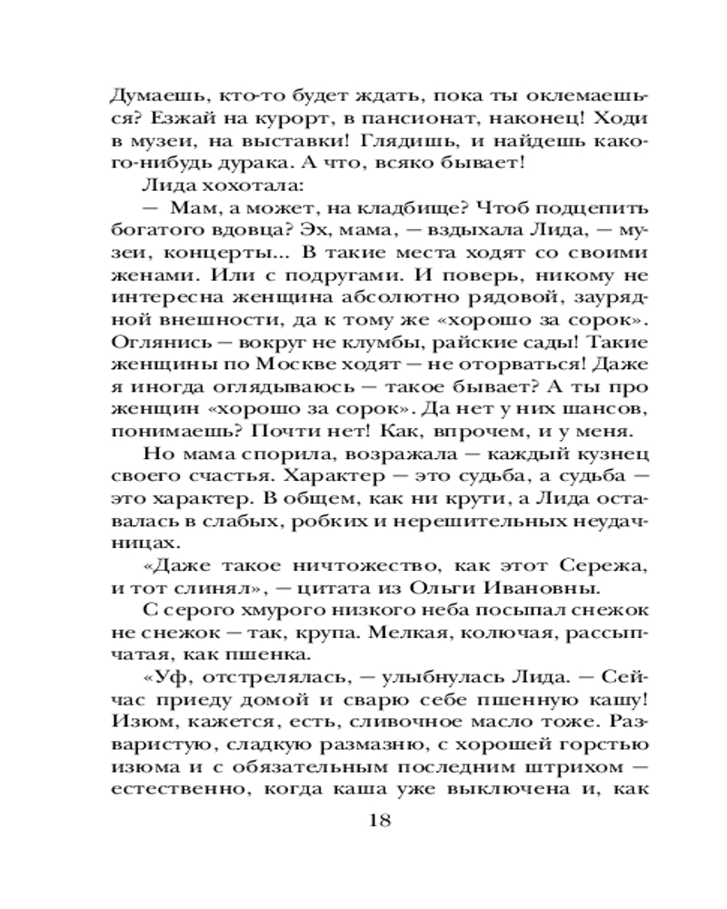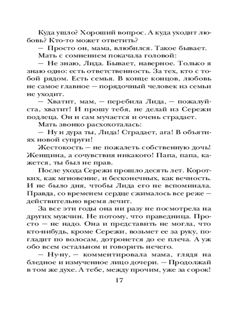 💳 Оплатить за товар можно при получении 🇰🇿 Есть бесплатная доставка по Казахстану 🎁 Копите бонусы с каждой покупки Серия: Женские судьбы. Уютная проза Марии Метлицкой. Новое оформление (обложка) Как много их — женщин с потухшим взглядом. Тех, что отказались от счастья во имя условностей, долга, сохранения семьи, которой на самом деле не существовало. Потому что семья — это люди, которые любят друг друга. Став взрослой, Лида поняла, что ее властная мама и мягкий, добрый отец вряд ли счастливы друг с другом. А потом отец познакомил ее с Тасей — женщиной, с которой ему было по-настоящему хорошо и которая ждала его много лет, точно зная, что он никогда не придет насовсем. Хотя бы раз в жизни каждый человек оказывается перед выбором: плыть по течению или круто всё изменить. Вот и Лидино время пришло. Пополнить ряды несчастных женщин, повторить судьбу Таси и собственной матери или рискнуть и использовать шанс стать счастливой? |