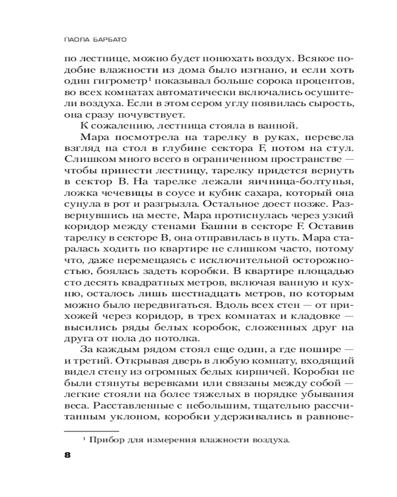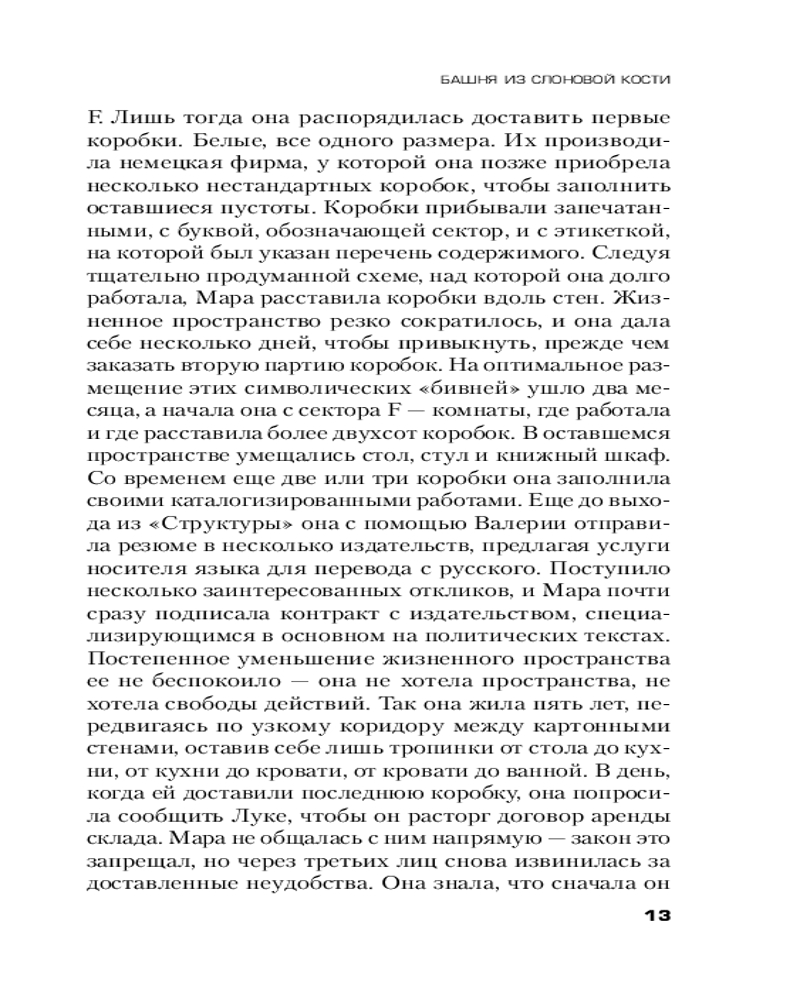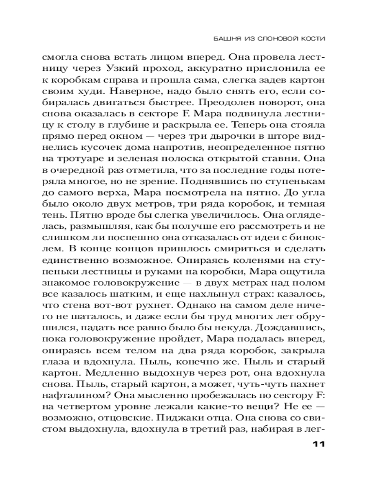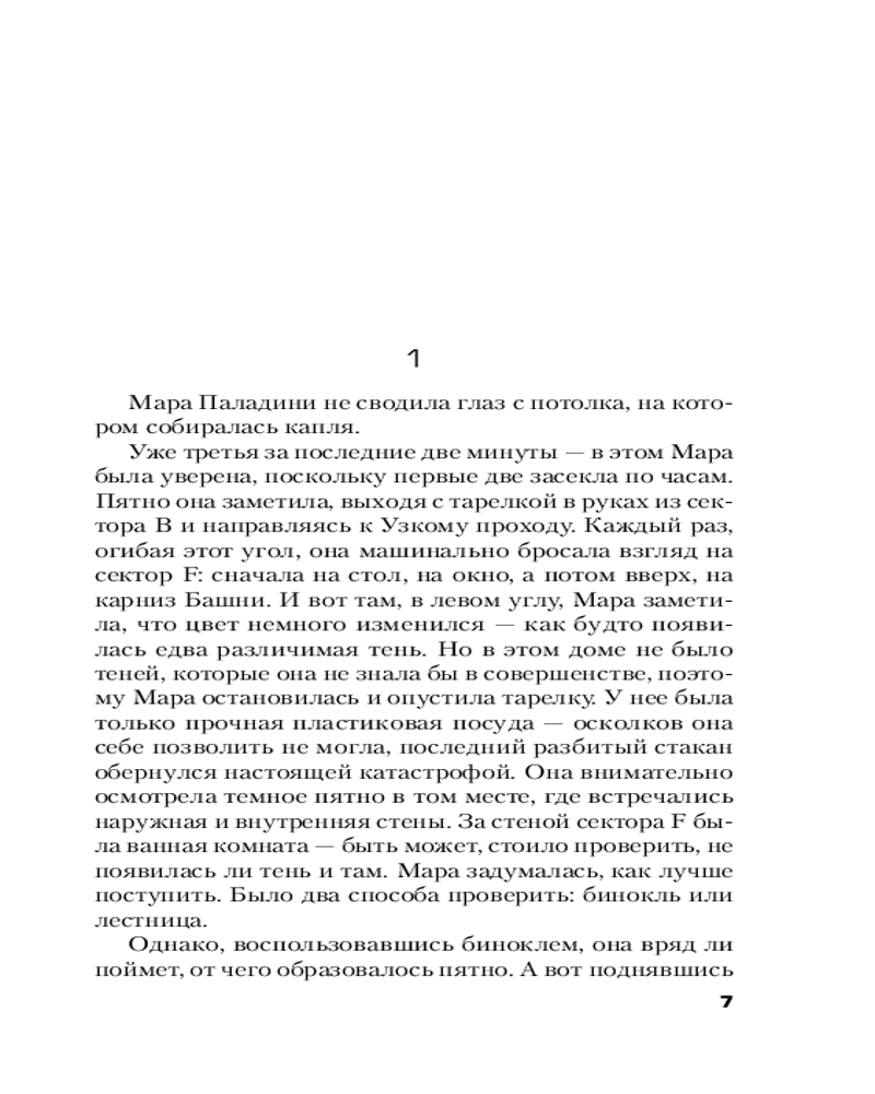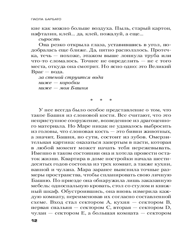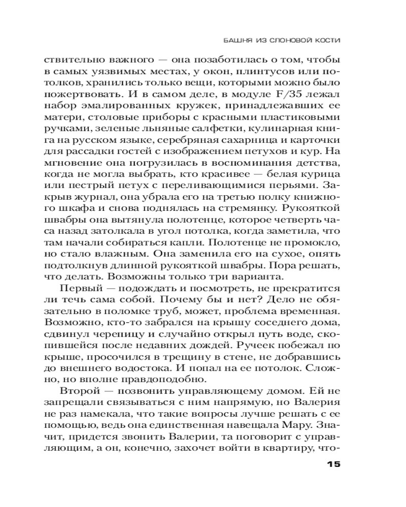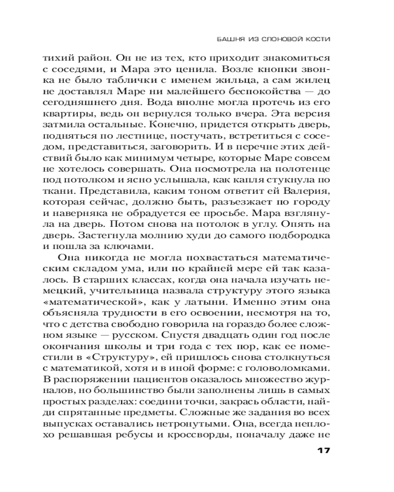 Мара Паладини — бывшая пациентка особой психиатрической клиники, прозванной «Структурой». Там она задумала, как будет жить на свободе новой жизнью. И сейчас живет именно так. Мара называет это Башней из слоновой кости — стены из белых коробок, максимально ограничивающие пространство квартиры, из которой женщина почти никогда не выходит. Она хочет навсегда отгородиться от мира и сравнивает Башню с пастью, которая в любой момент может начать ее пережевывать. Мару это устраивает, она этого хочет. Но одно маленькое пятно влаги на потолке разрушает этот странный план. Протечка из квартиры сверху. Из-за нее Башне придет конец. Мара поднимается к соседу и... обнаруживает того мертвым. Он убит при помощи растительного токсина, хорошо ей известного...