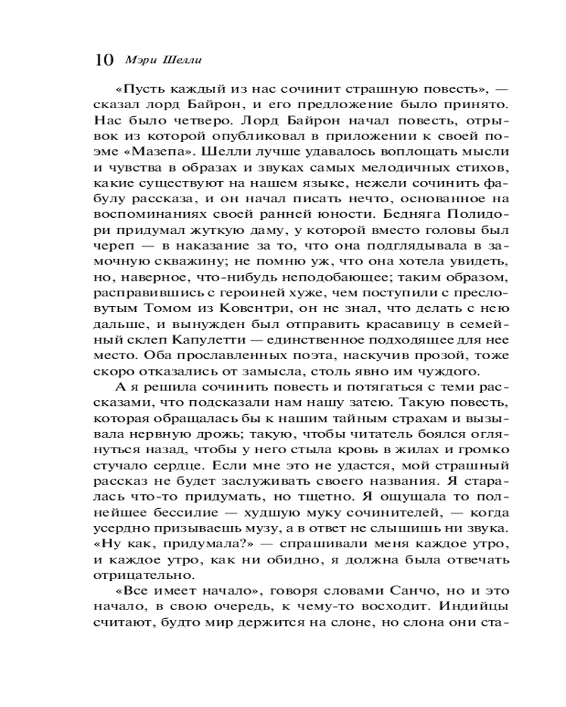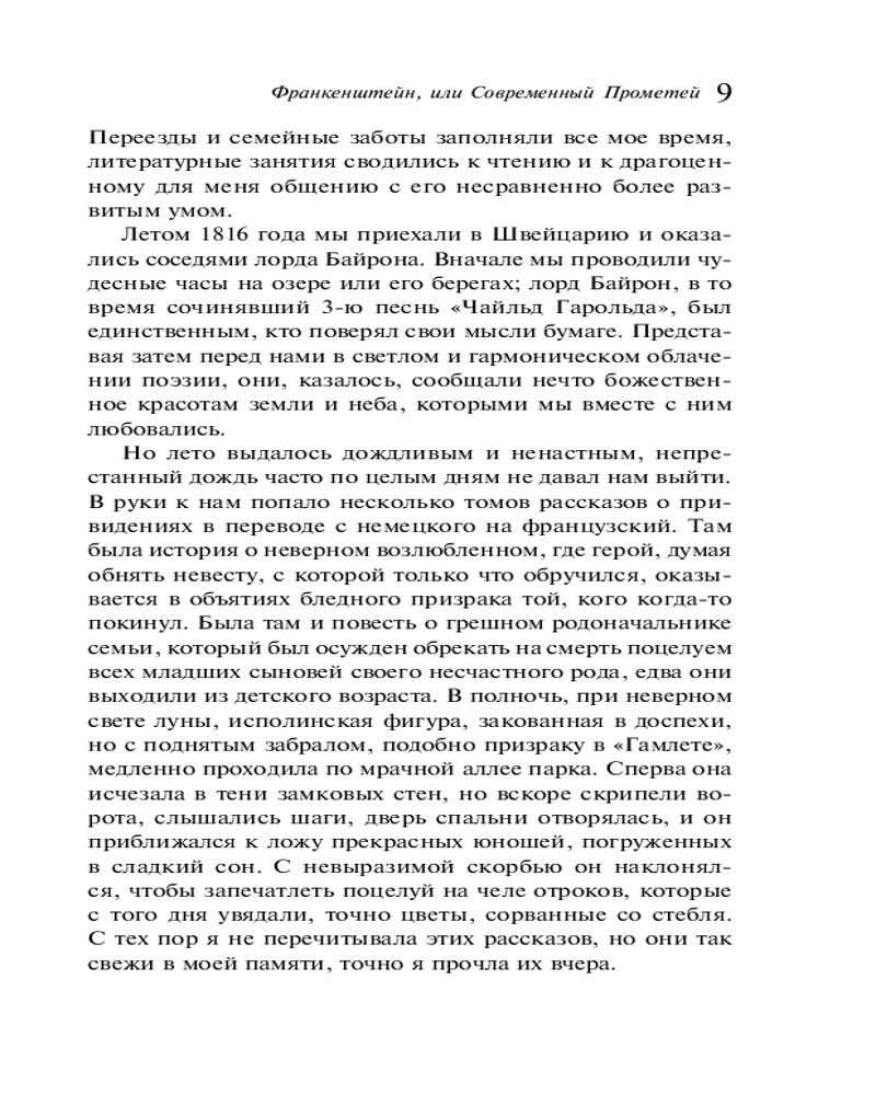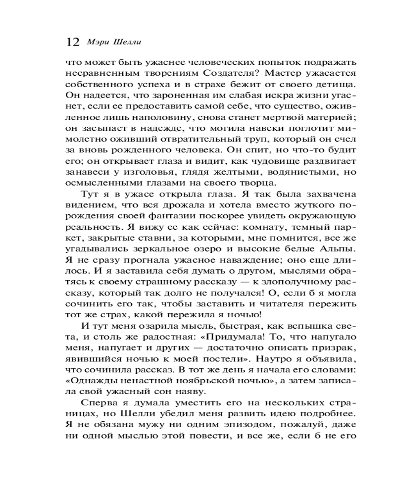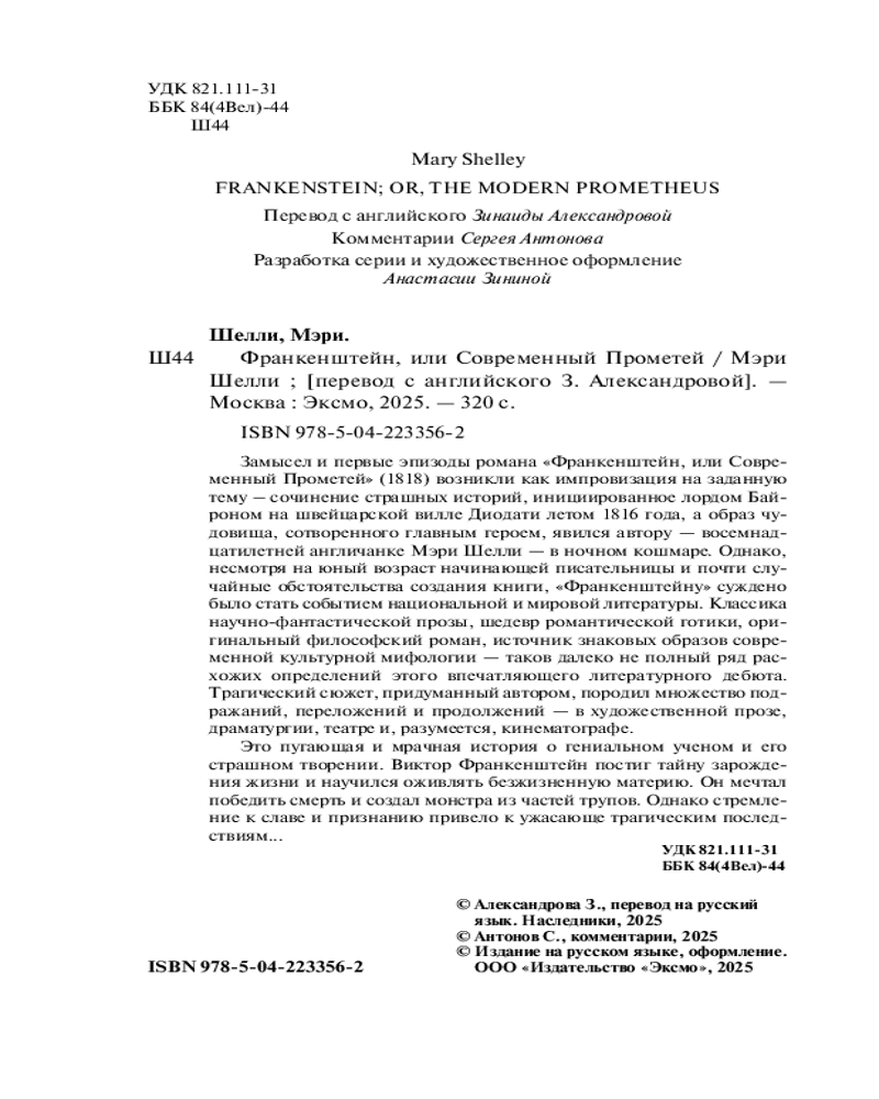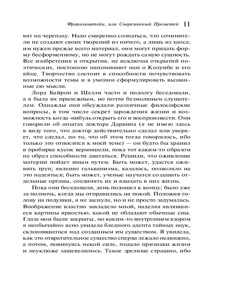Замысел и первые эпизоды романа «Франкенштейн, или Современный Прометей» (1818) возникли как импровизация на заданную тему — сочинение страшных историй, инициированное лордом Байроном на швейцарской вилле Диодати летом 1816 года, а образ чудовища, сотворенного главным героем, явился автору — восемнадцатилетней англичанке Мэри Шелли — в ночном кошмаре. Однако, несмотря на юный возраст начинающей писательницы и почти случайные обстоятельства создания книги, «Франкенштейну» суждено было стать событием национальной и мировой литературы. Классика научно-фантастической прозы, шедевр романтической готики, оригинальный философский роман, источник знаковых образов современной культурной мифологии — таков далеко не полный ряд расхожих определений этого впечатляющего литературного дебюта. Трагический сюжет, придуманный автором, породил множество подражаний, переложений и продолжений — в художественной прозе, драматургии, театре и, разумеется, кинематографе. |