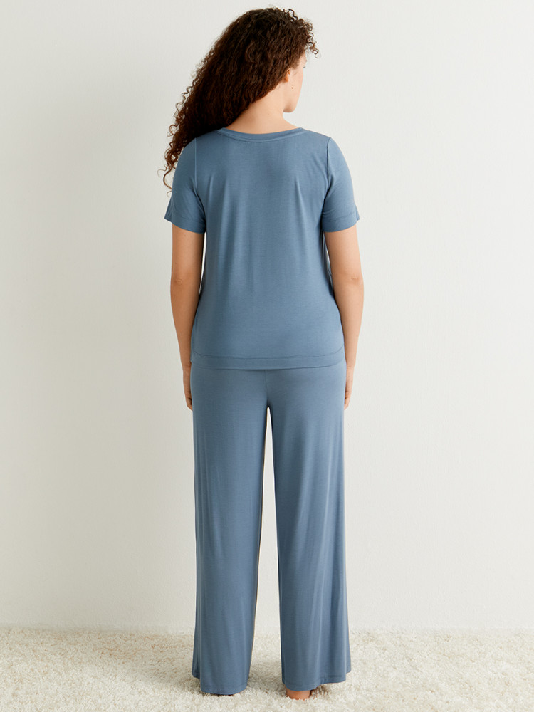 Женский домашний комплект: свободная футболка с коротким рукавом и круглым вырезом и прямые брюки без карманов с резинкой на поясе. Изготовлен из легкой и нежной вискозы, которая обладает высокой воздухопроницаемостью и отлично впитывает влагу, приятно ощущается независимо от окружающей температуры, долго сохраняет цвет и не накапливает статическое электричество. Повседневный костюм для дома, который идеально сочетает в себе лаконичный дизайн, удобный крой и качественное исполнение. Представлен в трендовых базовых цветах.