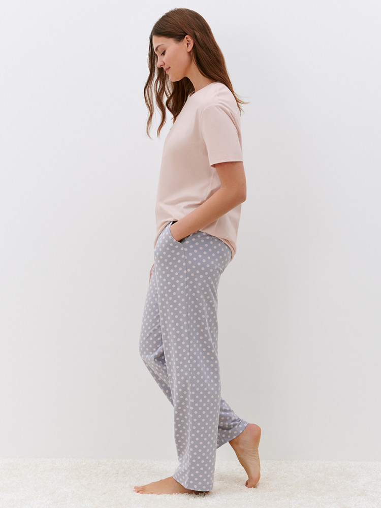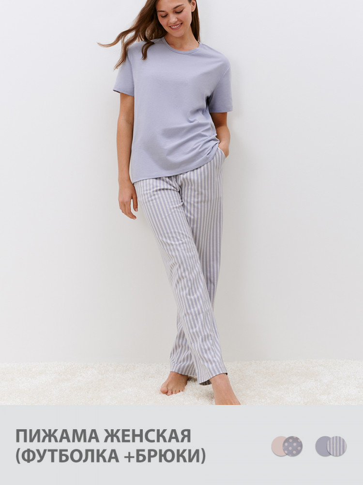 Женский домашний комплект: свободная футболка с коротким рукавом и круглым вырезом, и прямые брюки с карманами и поясом на резинке. Изготовлен из высококачественного хлопка, который отлично пропускает воздух, приятно ощущается на теле и подходит для чувствительной кожи. Комфортный повседневный костюм для дома и сна, который идеально сочетает в себе лаконичный дизайн, удобный крой и качественное исполнение. Представлен в трендовых базовых цветах.