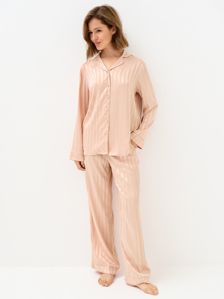 Женская пижама в полоску: рубашка на пуговицах с длинными рукавами и отложным воротником, с однотонным кантом и манжетами; прямые брюки с поясом на резинке, боковыми карманами и манжетами с однотонным кантом. Изготовлена из гладкого и лёгкого искусственного шёлка, который приятно ощущается на теле и хорошо сохраняет форму. Деликатная обработка краёв обеспечивает дополнительный комфорт. Воплощение элегантности в домашнем формате: расслабленный силуэт, благородное сияние ткани и лаконичный принт. Отлично подходит для дома и сна.