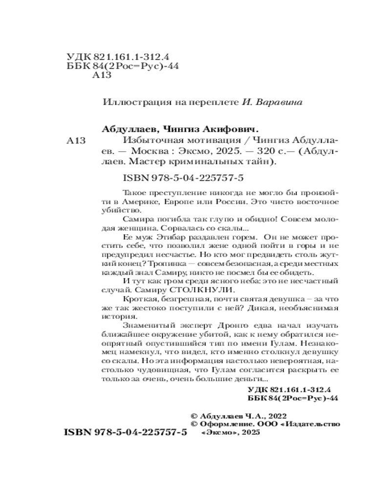 💳 Оплатить за товар можно при получении 🇰🇿 Есть бесплатная доставка по Казахстану 🎁 Копите бонусы с каждой покупки Серия: Абдуллаев. Мастер криминальных тайн (обложка) Такое преступление никогда не могло бы произойти в Америке, Европе или России. Это чисто восточное убийство. Самира погибла так глупо и обидно! Совсем молодая женщина. Сорвалась со скалы... Ее муж Этибар раздавлен горем. Он не может простить себе, что позволил жене одной пойти в горы и не предупредил несчастье. Но кто мог предвидеть столь жуткий конец? Тропинка — совсем безопасная, а среди местных каждый знал Самиру, никто не посмел бы ее обидеть. И тут как гром среди ясного неба: это не несчастный случай. Самиру столкнули. |