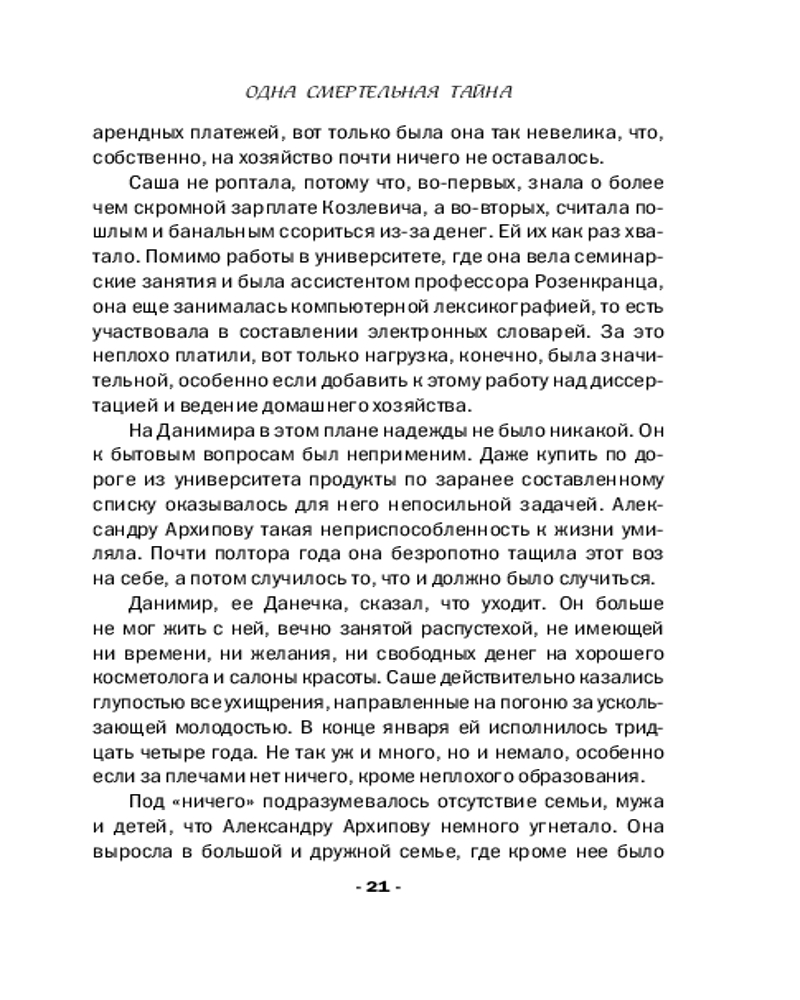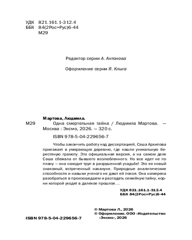 💳 Оплатить за товар можно при получении 🇰🇿 Есть бесплатная доставка по Казахстану 🎁 Копите бонусы с каждой покупки Серия: Желание женщины. Детективные романы Л. Мартовой. Новое оформление (обложка) Чтобы закончить работу над диссертацией, Саша Архипова приезжает в умирающую деревню, где нашли уникальную берестяную грамоту. Это официальная версия, а на самом деле Саша сбежала от бывшего возлюбленного. Но всё идет не по плану — она находит труп в разрушенной усадьбе! Это ее новый знакомый, встреченный накануне. Природные аналитические способности и навыки ученого не дают ей покоя. Она намерена разобраться в произошедшем и разгадать семейную тайну, корни которой уходят в далекое прошлое... |