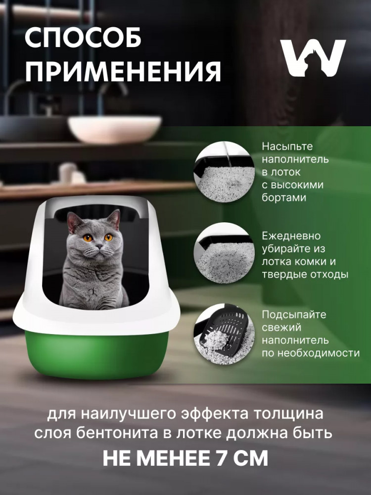 Натуральный глиняный наполнитель Wonder White также обладает высокой впитывающей способностью и производит низкий уровень пыли, что помогает свести к минимуму беспорядок в ванной комнате. Для наилучшего эффекта толщина слоя бентонита в лотке должна быть не менее 7 см.