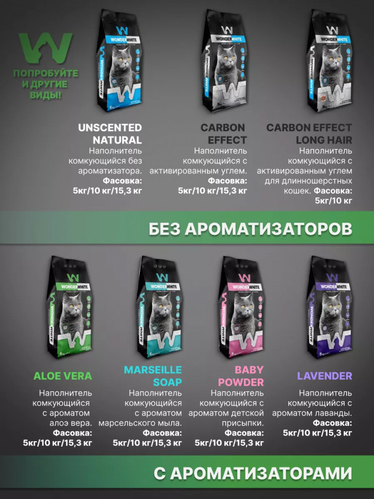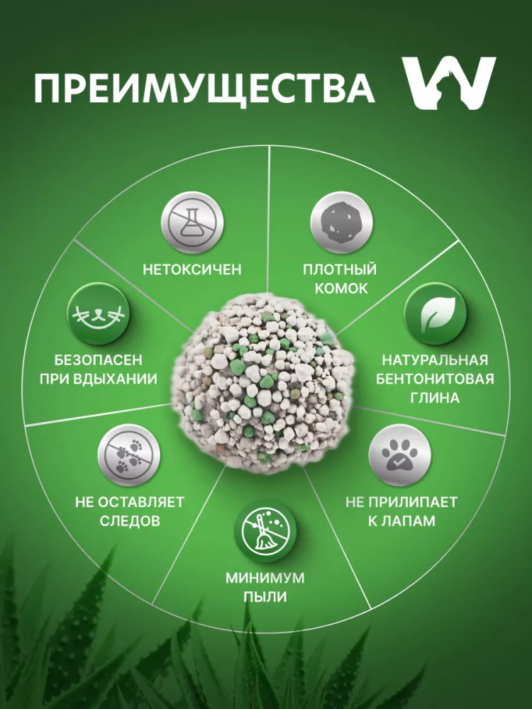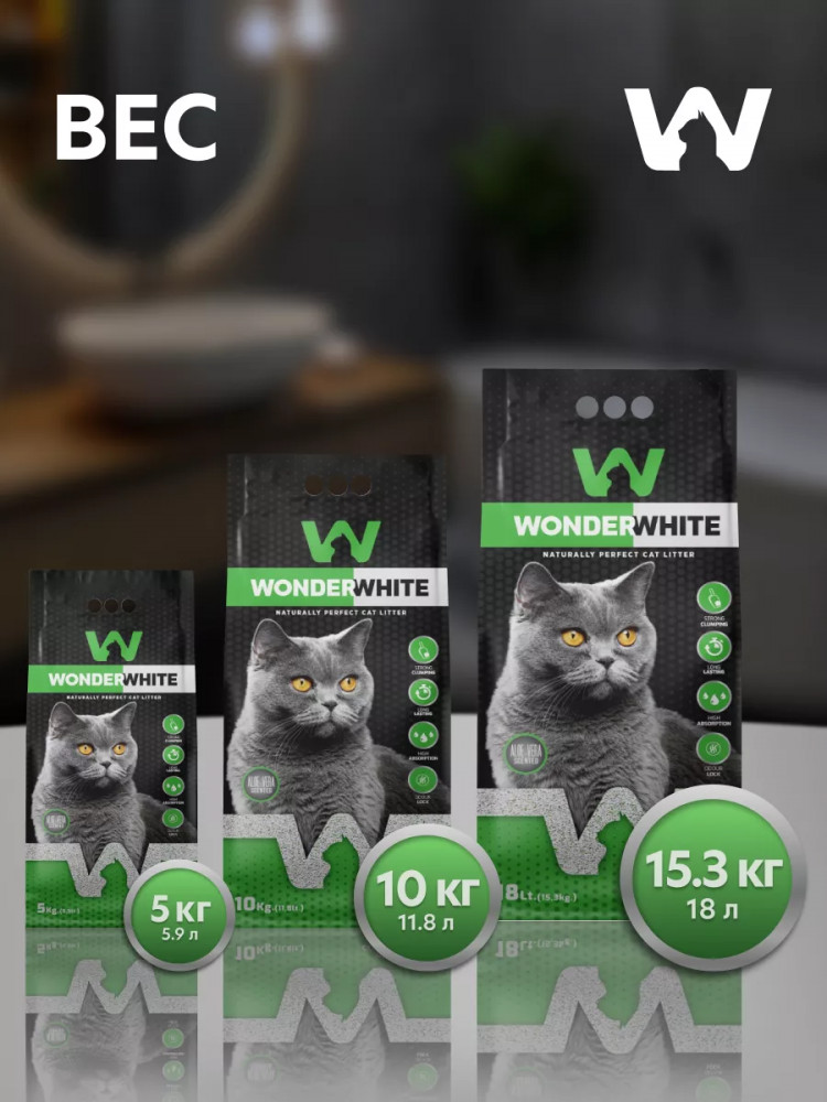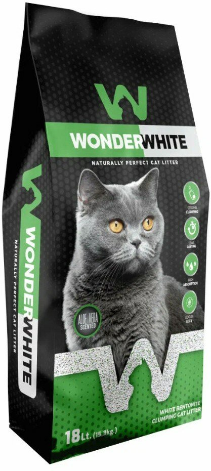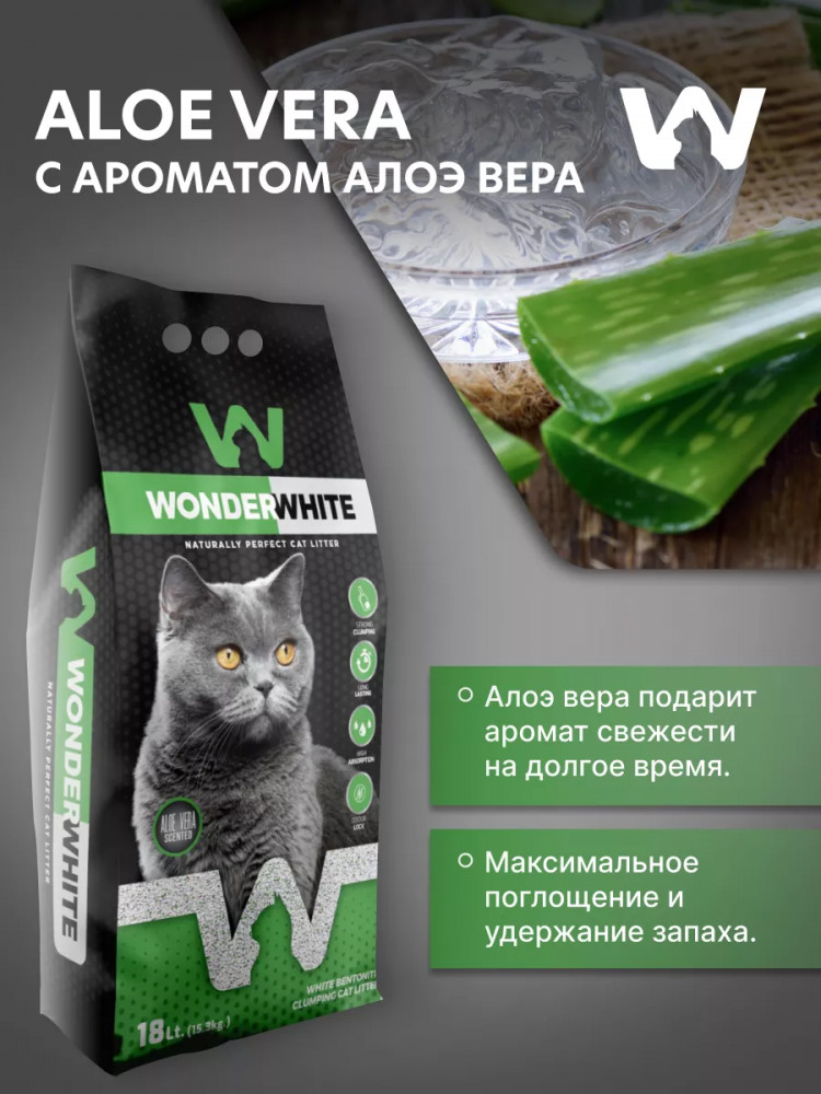 Комкующийся наполнитель Wonder White Aloe Vera для кошачьего туалета изготовленный из 100 % натуральной глины с ароматом алоэ вера.